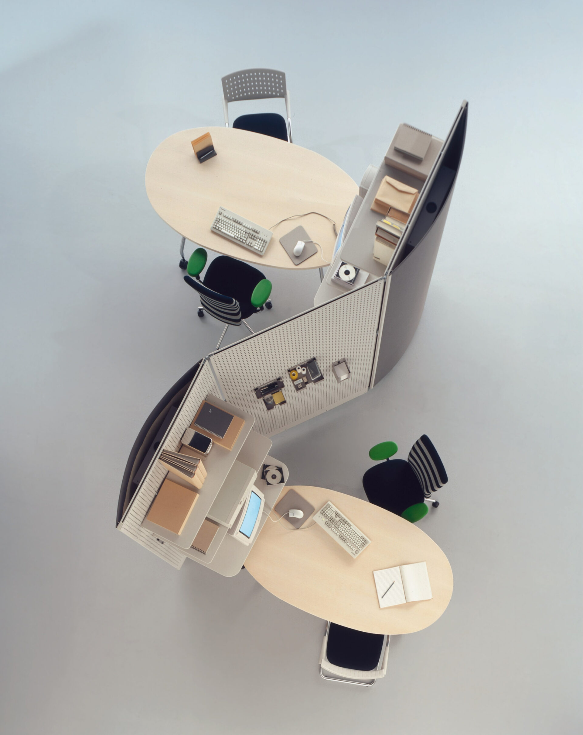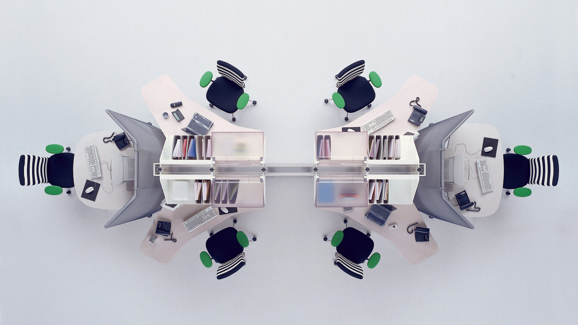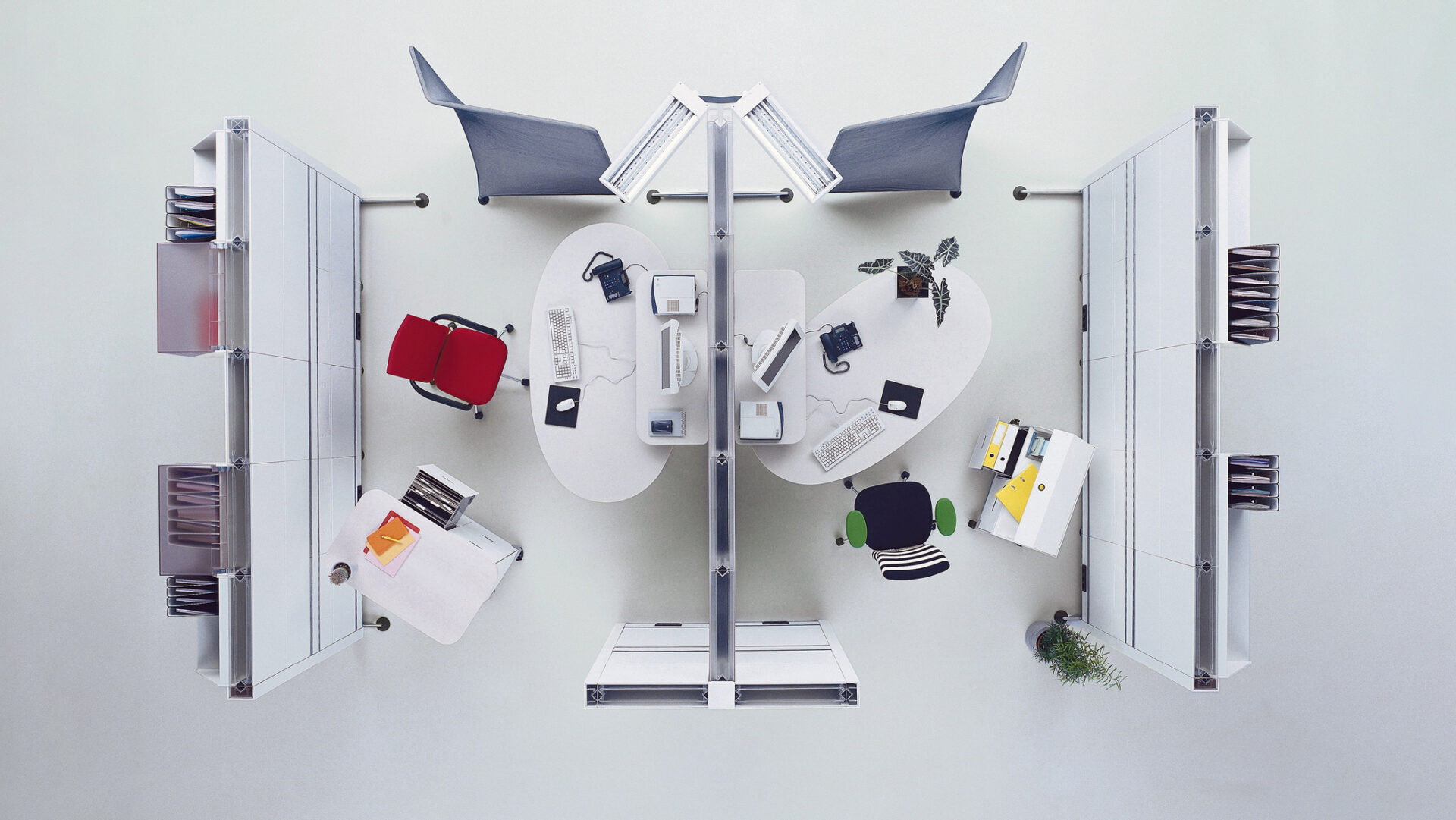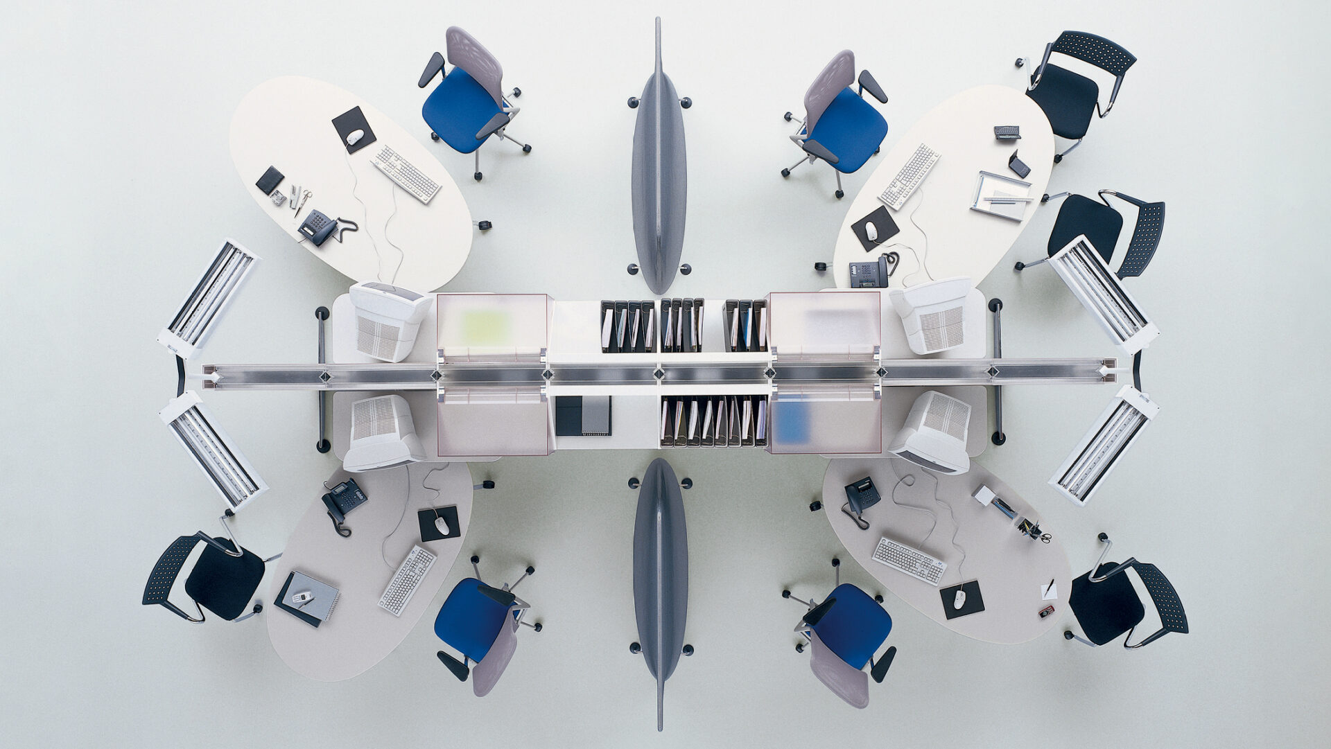 Developed as an extension of the Ad Hoc system for Vitra, Ad Wall introduced a vertical partition element that redefined the relationship between desk and space. Conceived for open-plan offices, it allowed workstations to evolve from individual use to shared, meeting-oriented configurations.