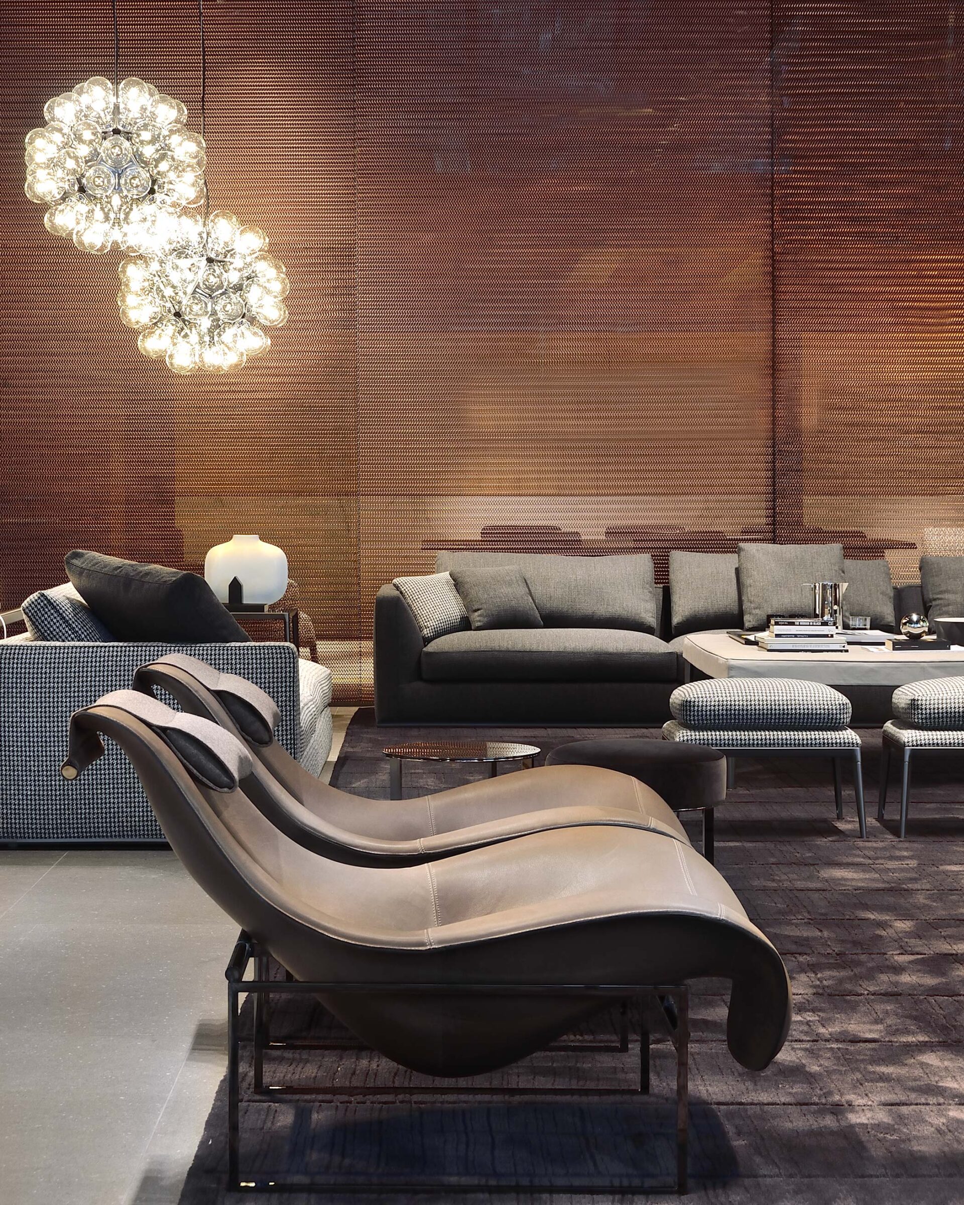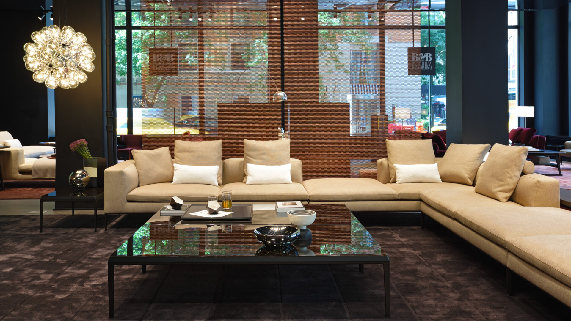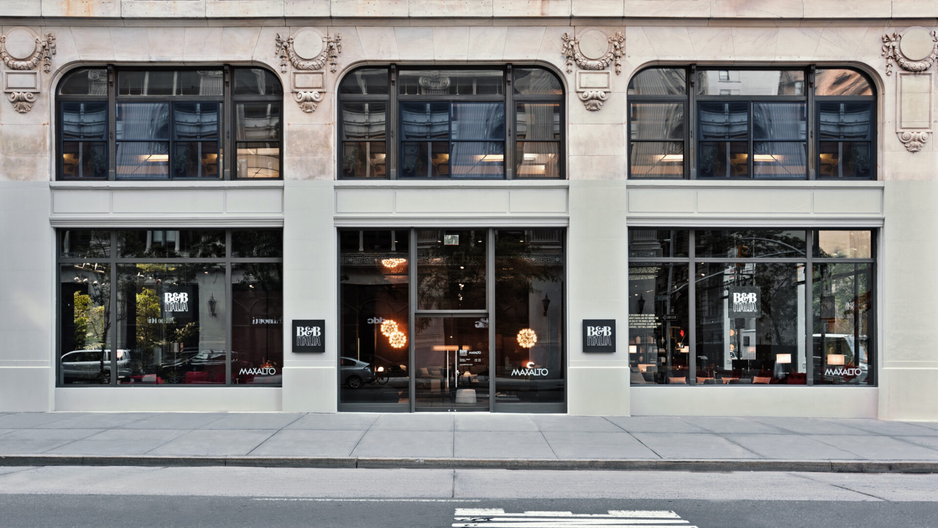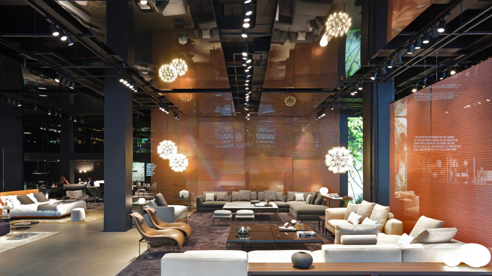 Showroom for B&B Italia on Madison Avenue, New York, set within a 1910 building. The project preserves original volumes and openings while introducing a continuous exhibition space, where reflective ceilings, metal mesh partitions and a winter garden define a sequence of settings for product display.