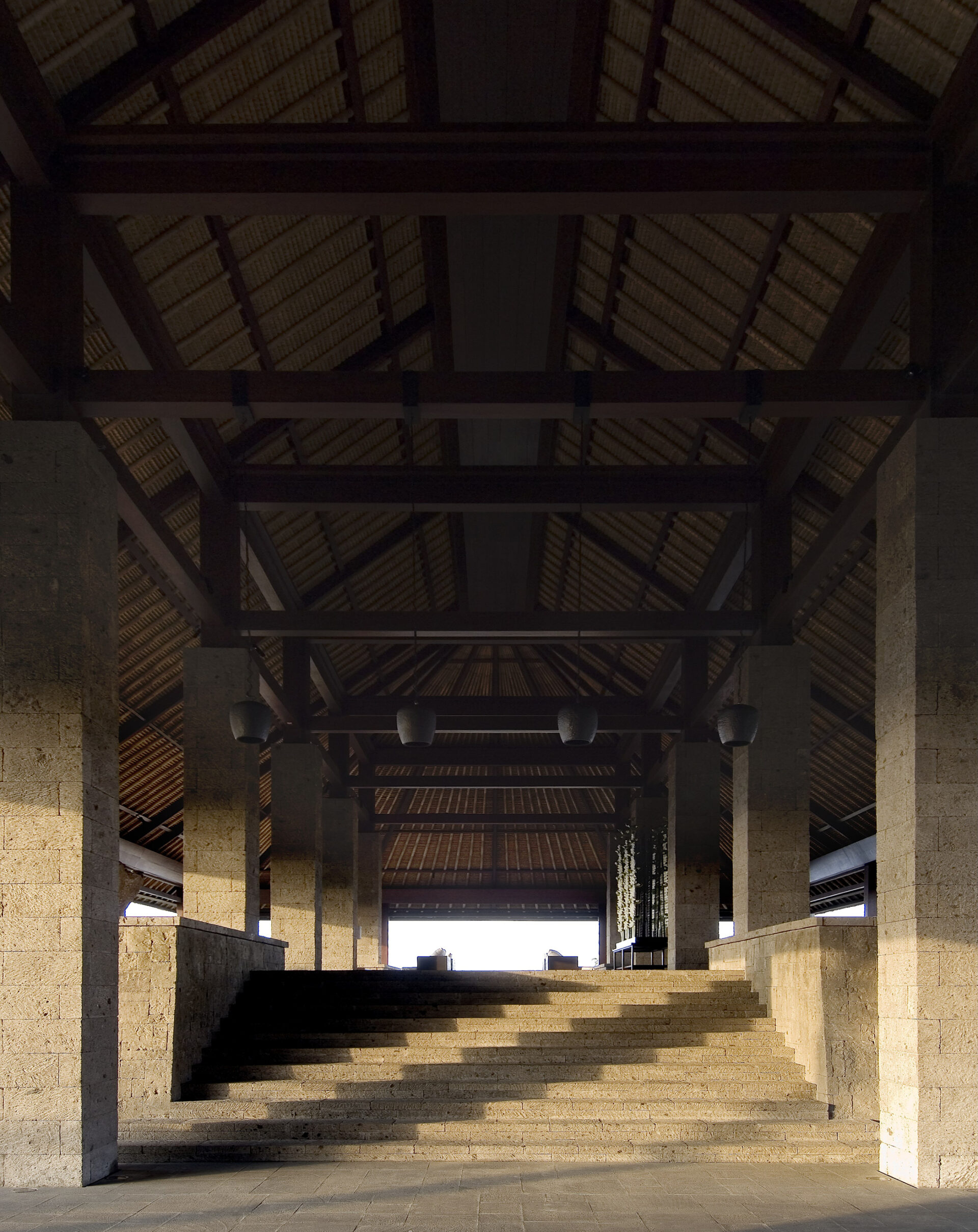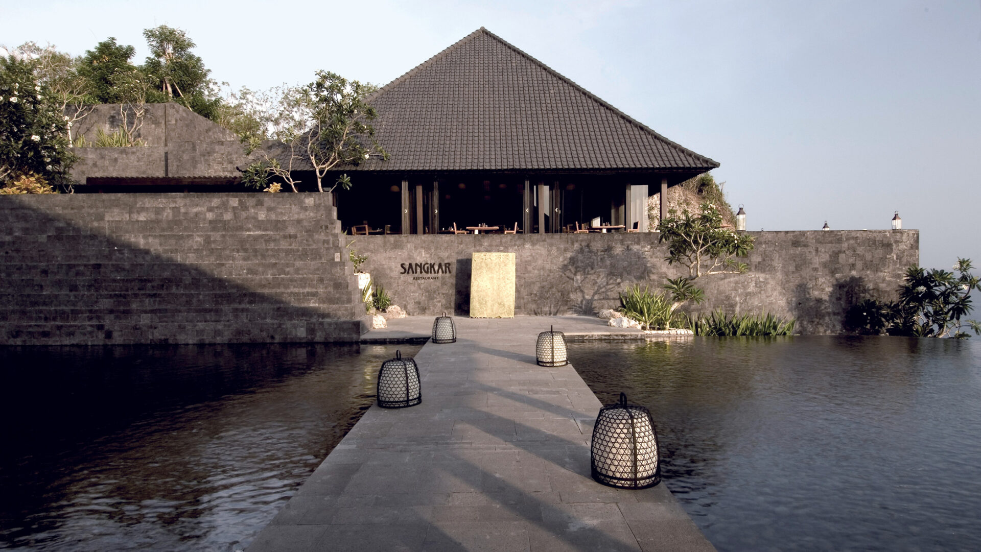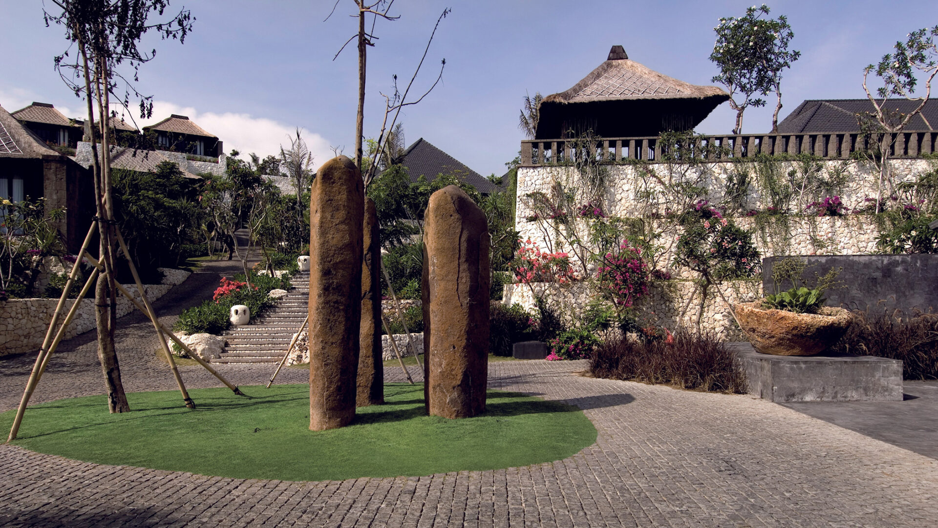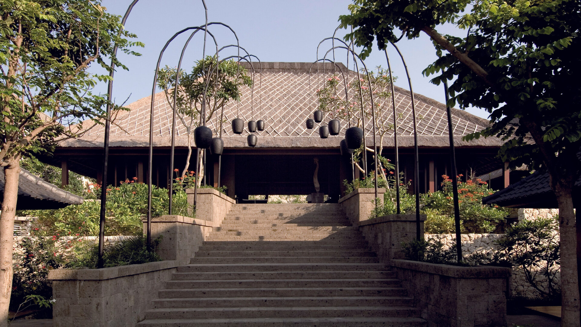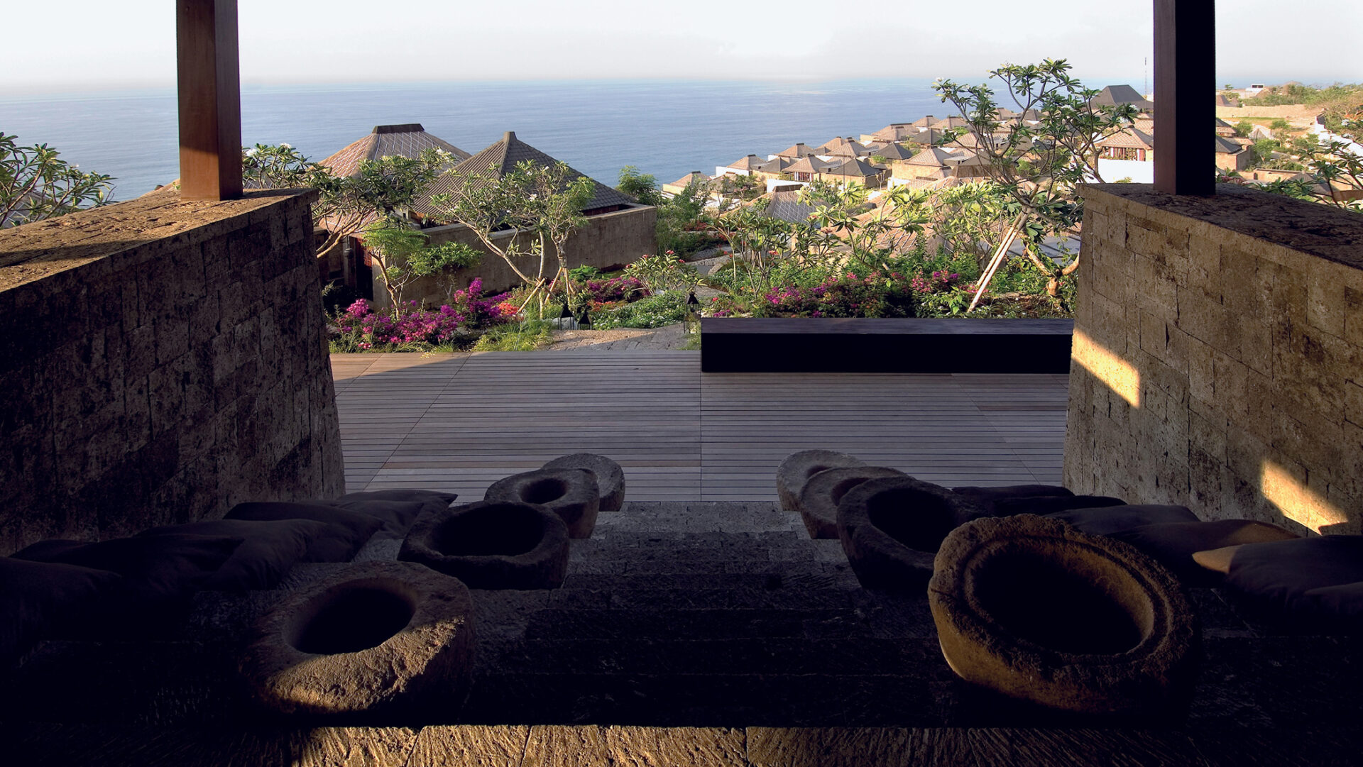 Organised as a protected cliffside village, the resort clearly separates private domains from public areas facing the ocean. Architecture, interiors and landscape adopt local building techniques and a unified bangkiray palette, echoing the principles of Balinese courtyards and gardens.