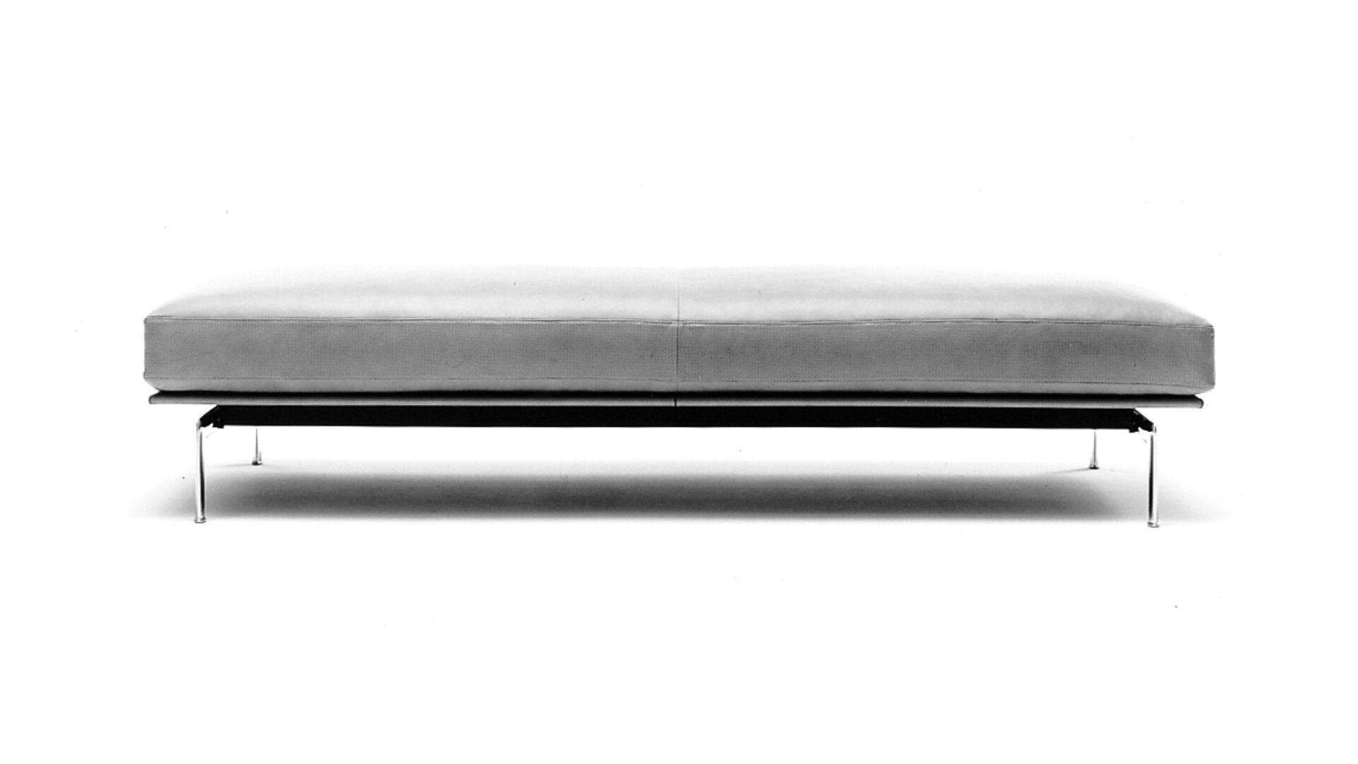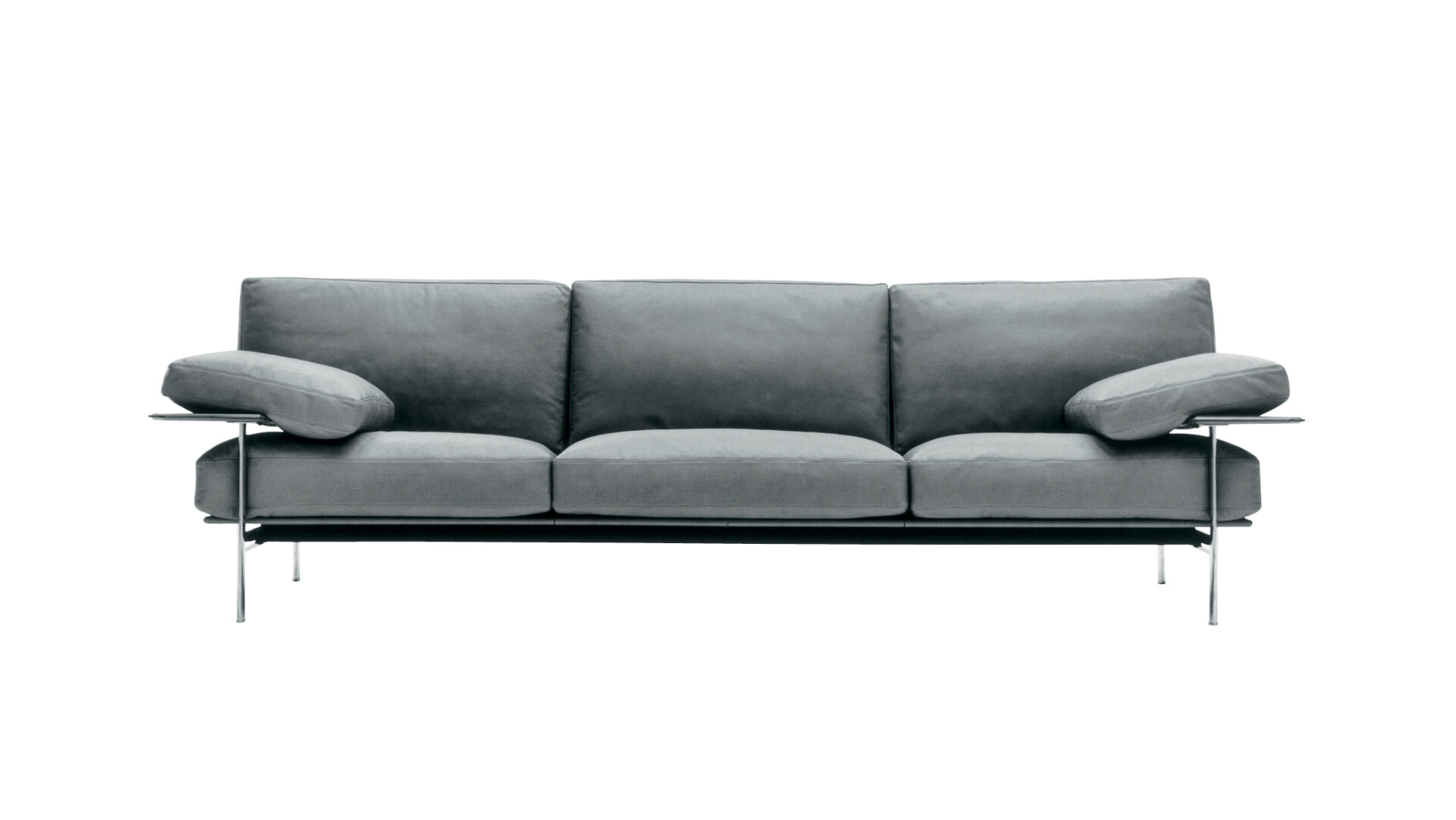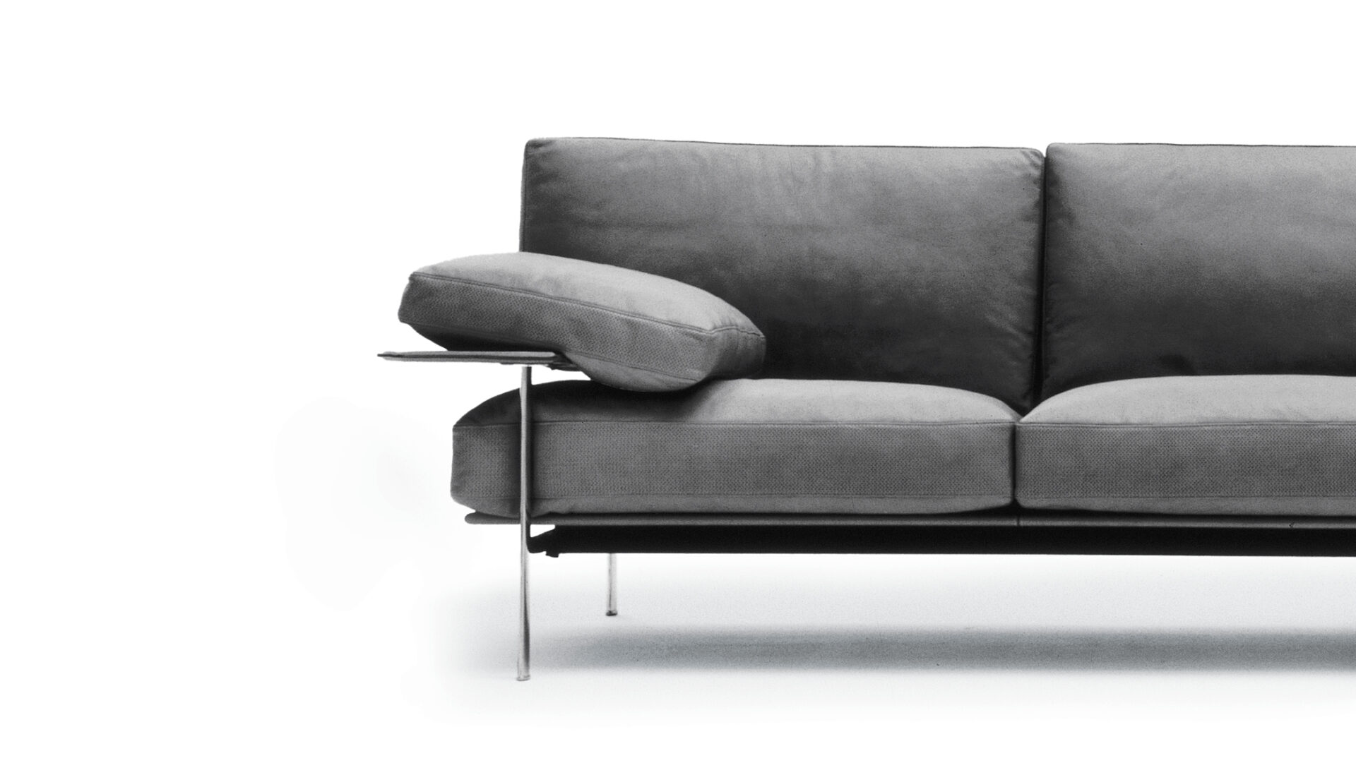 A die-cast aluminium exoskeleton supports thick leather-clad elements and down-filled cushions, making structure visible. Merging industrial logic and tactile comfort, it established a new typology for modern upholstered seating.