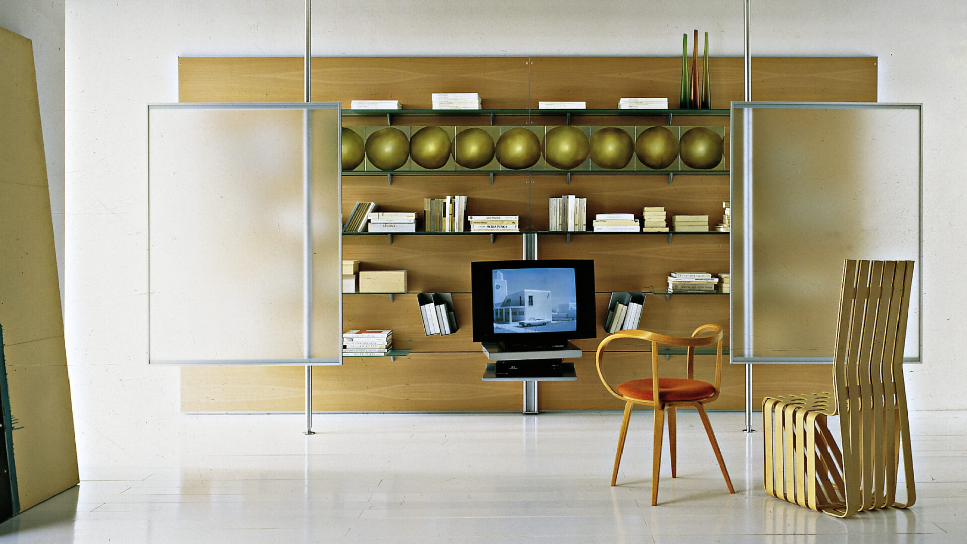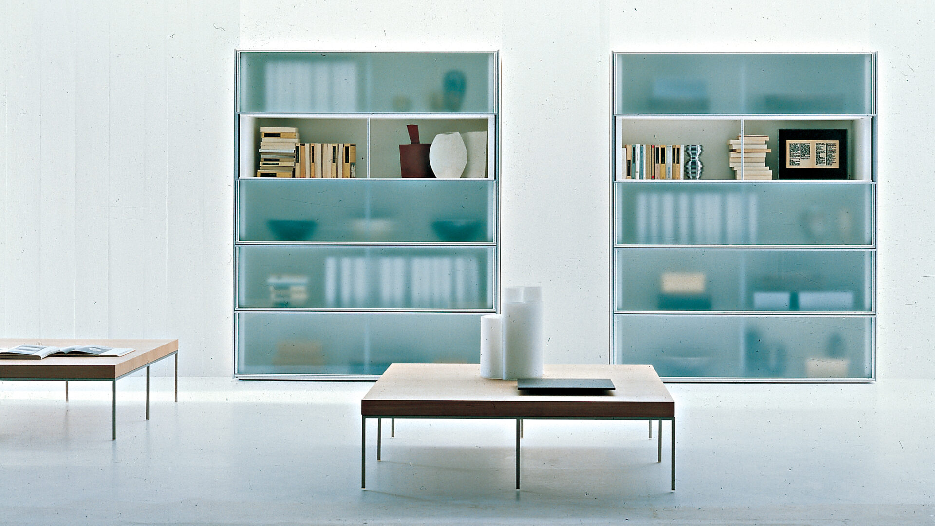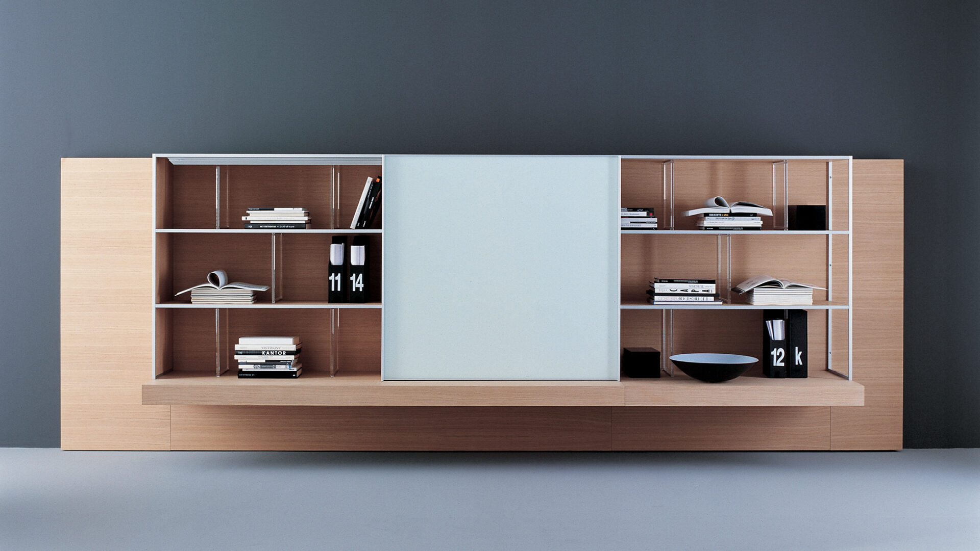 A modular storage system extending beyond the traditional wardrobe to include bookcases, display units, and modular wall-mounted compositions. Developed with B&B Italia’s R&D Centre, it introduced an innovative vertical sliding-door mechanism that replaced traditional hinged openings.