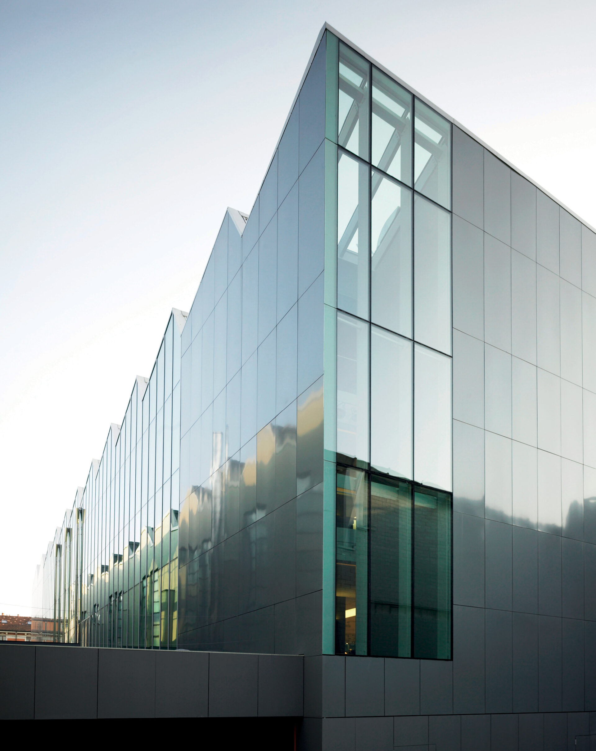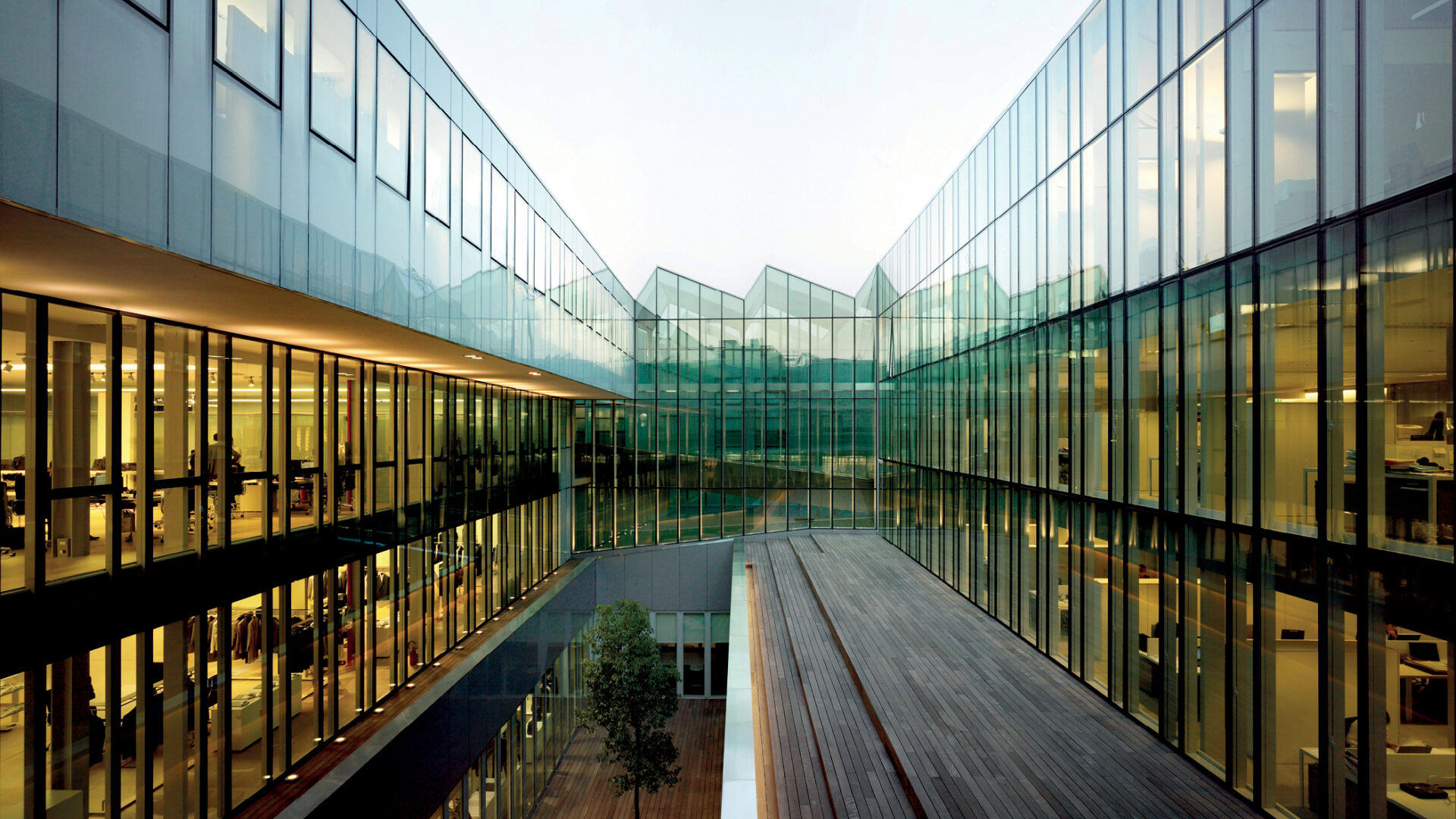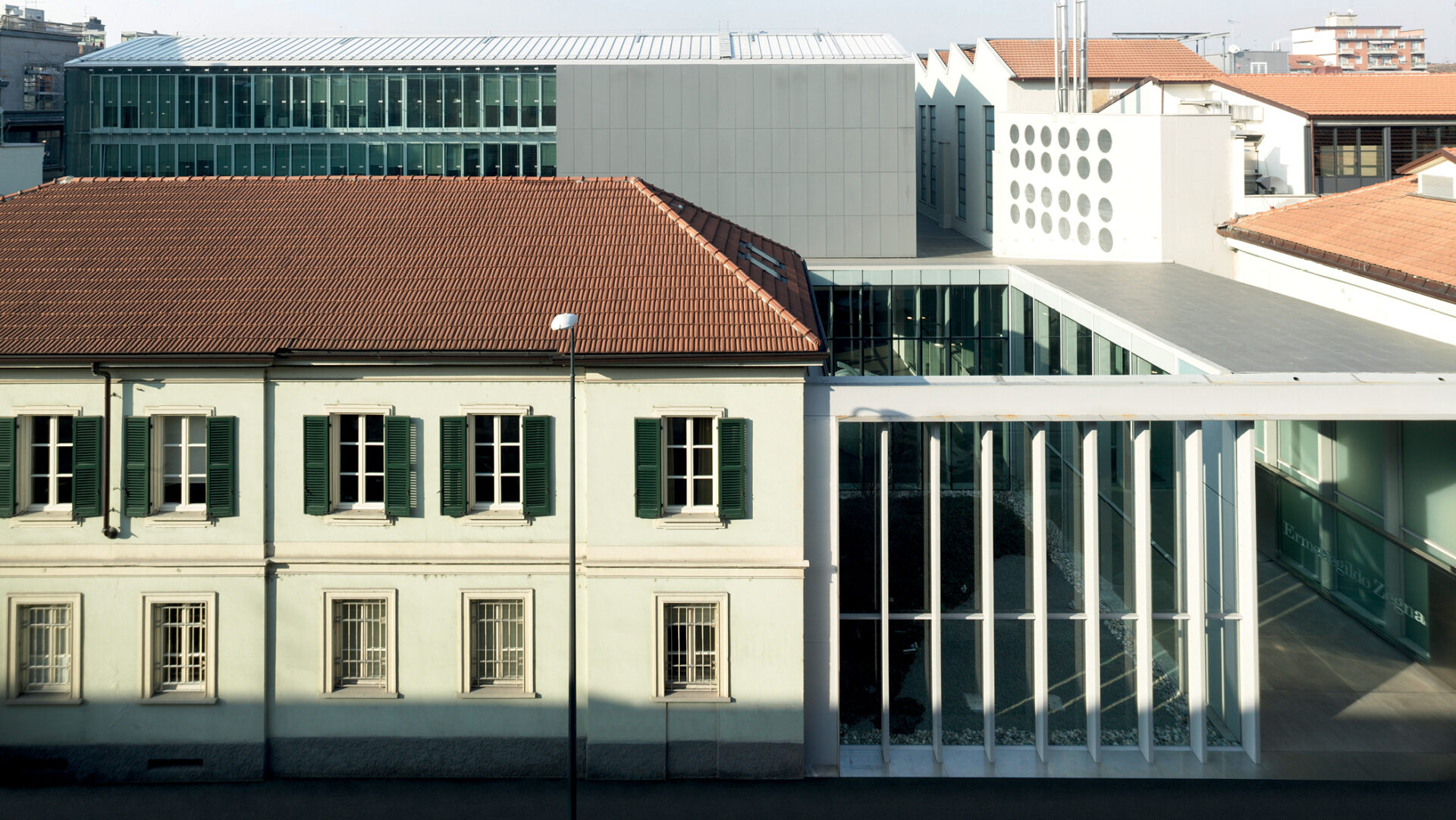 New-build Headquarters for Ermenegildo Zegna Group in the Tortona district of Milan, reinterpreting the saw-tooth industrial type as a compact, inward-facing workplace organized around a central courtyard-theatre and a glazed atrium on Via Savona.
