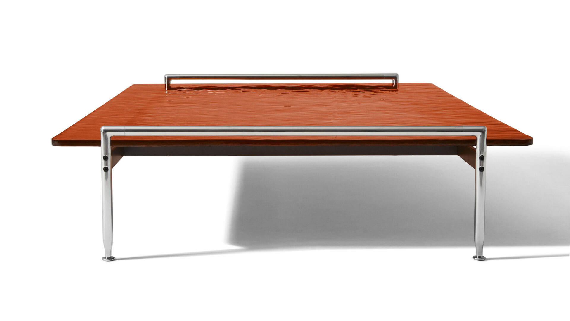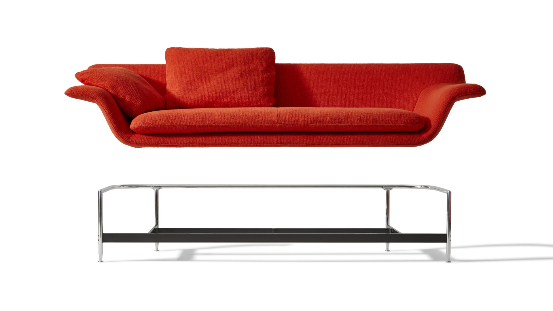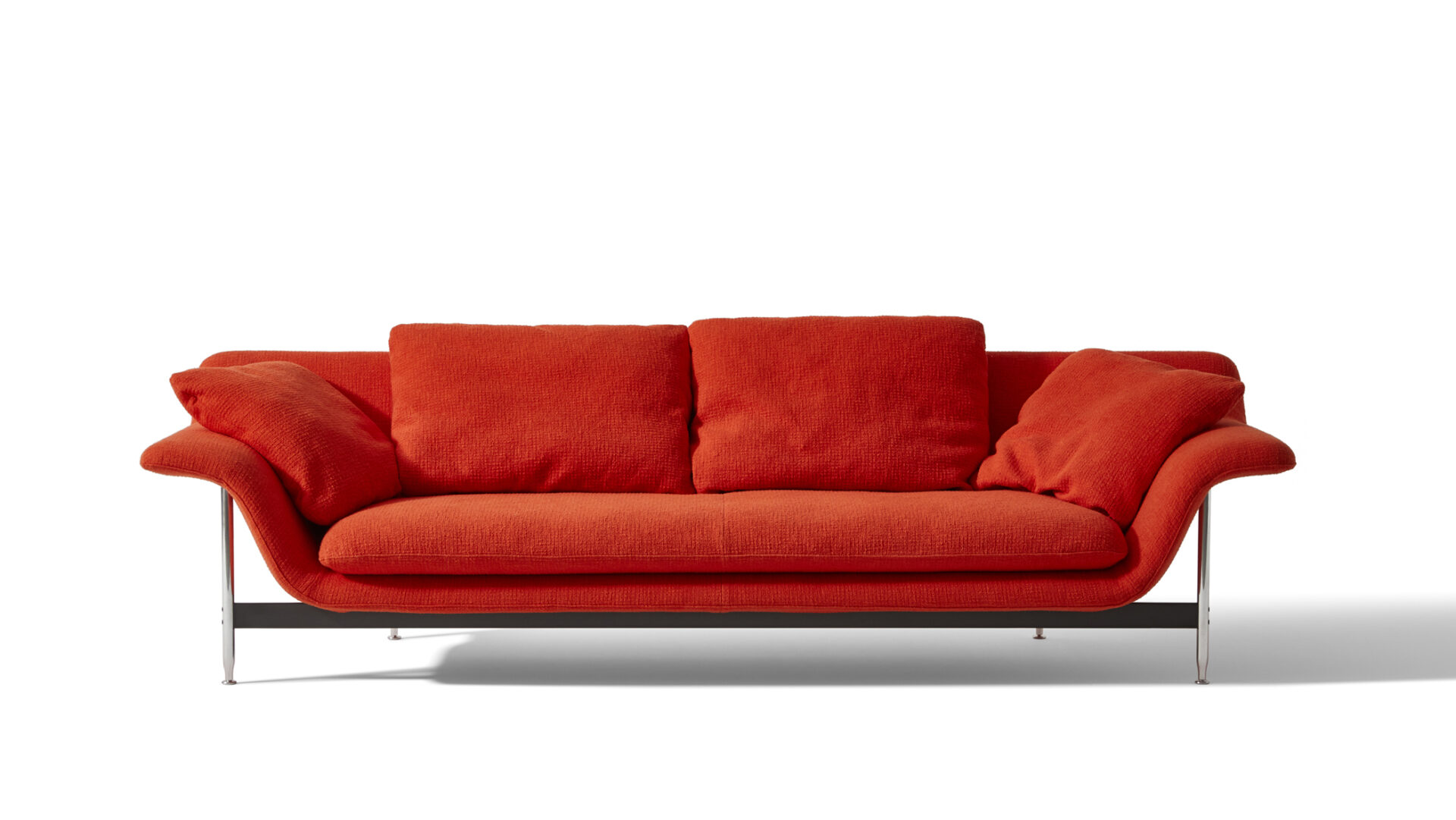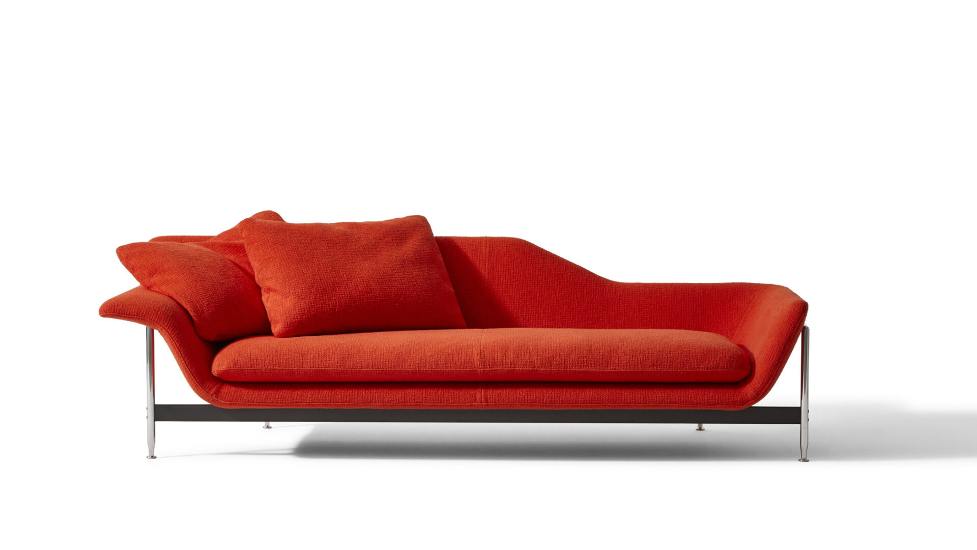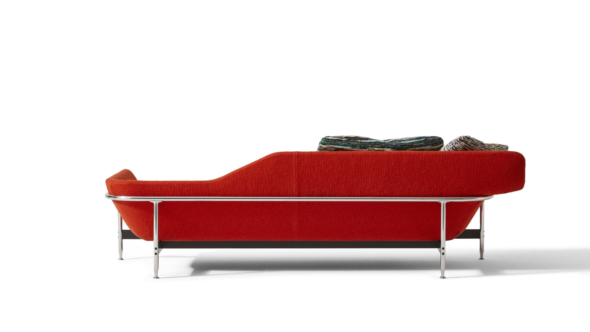 Sofa system built around a polished aluminium exoskeleton supporting a soft shell and cushions with recycled-content fillings. Eight modular elements allow linear or corner configurations, merging comfort with contemporary research into material circularity.