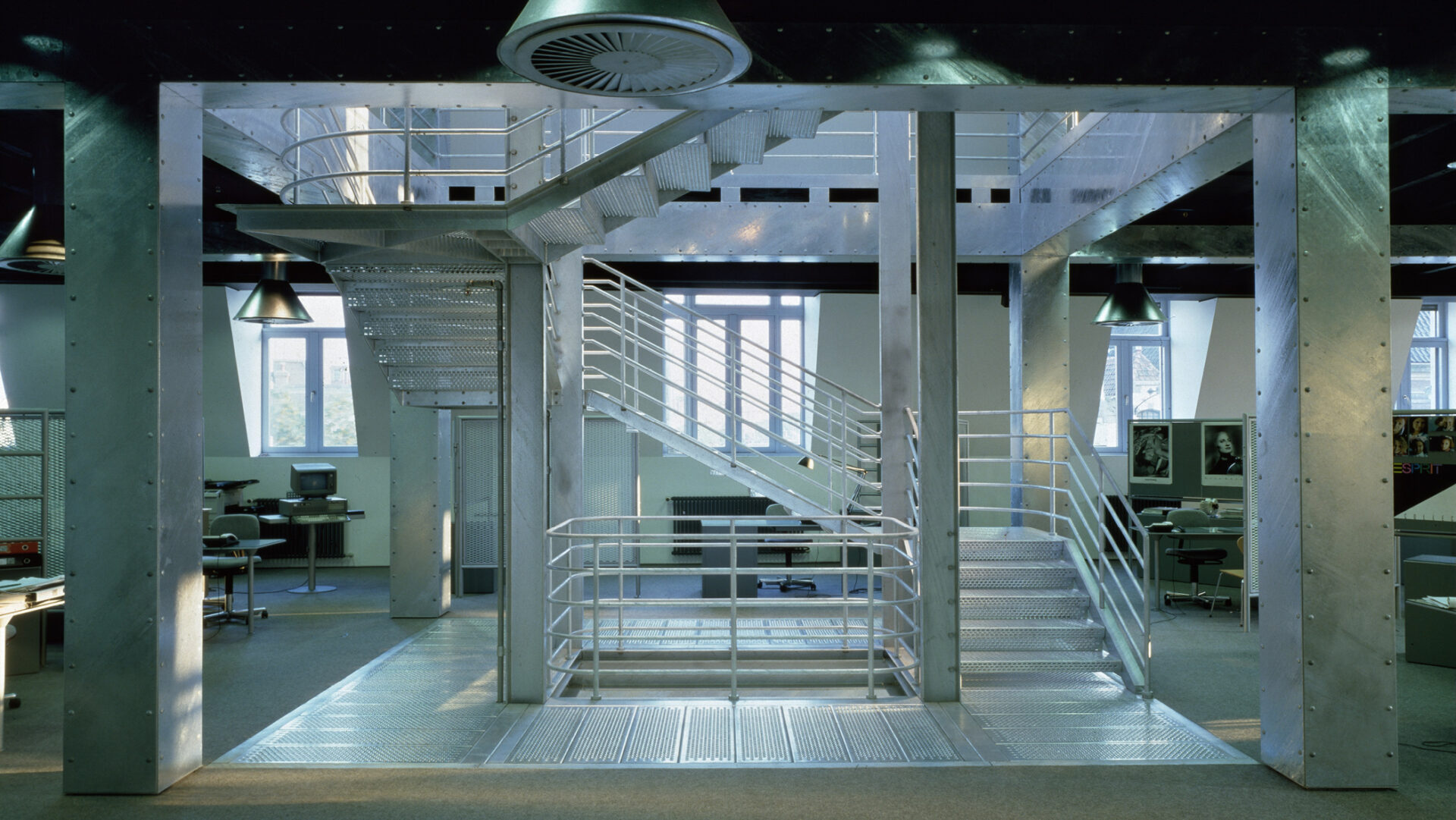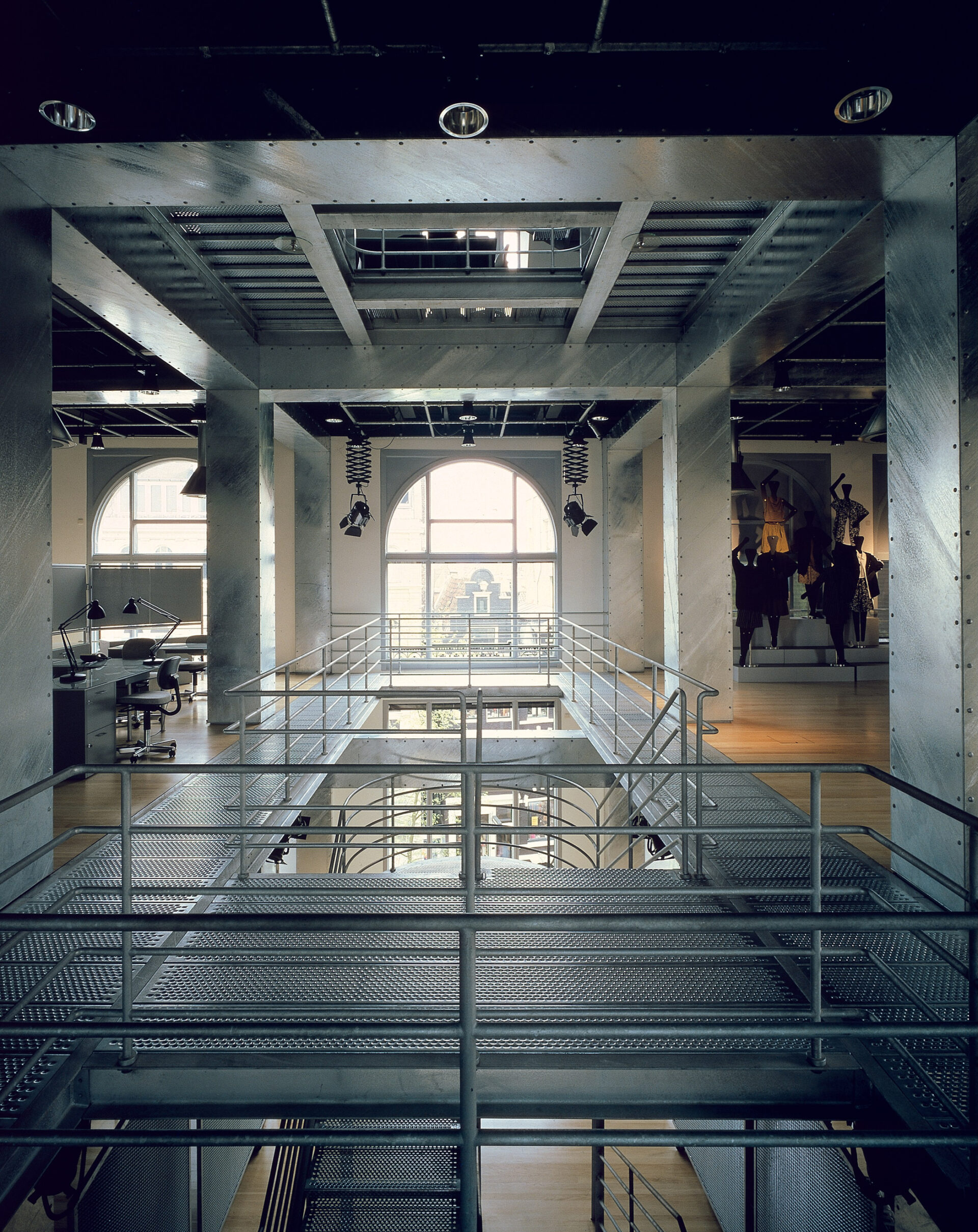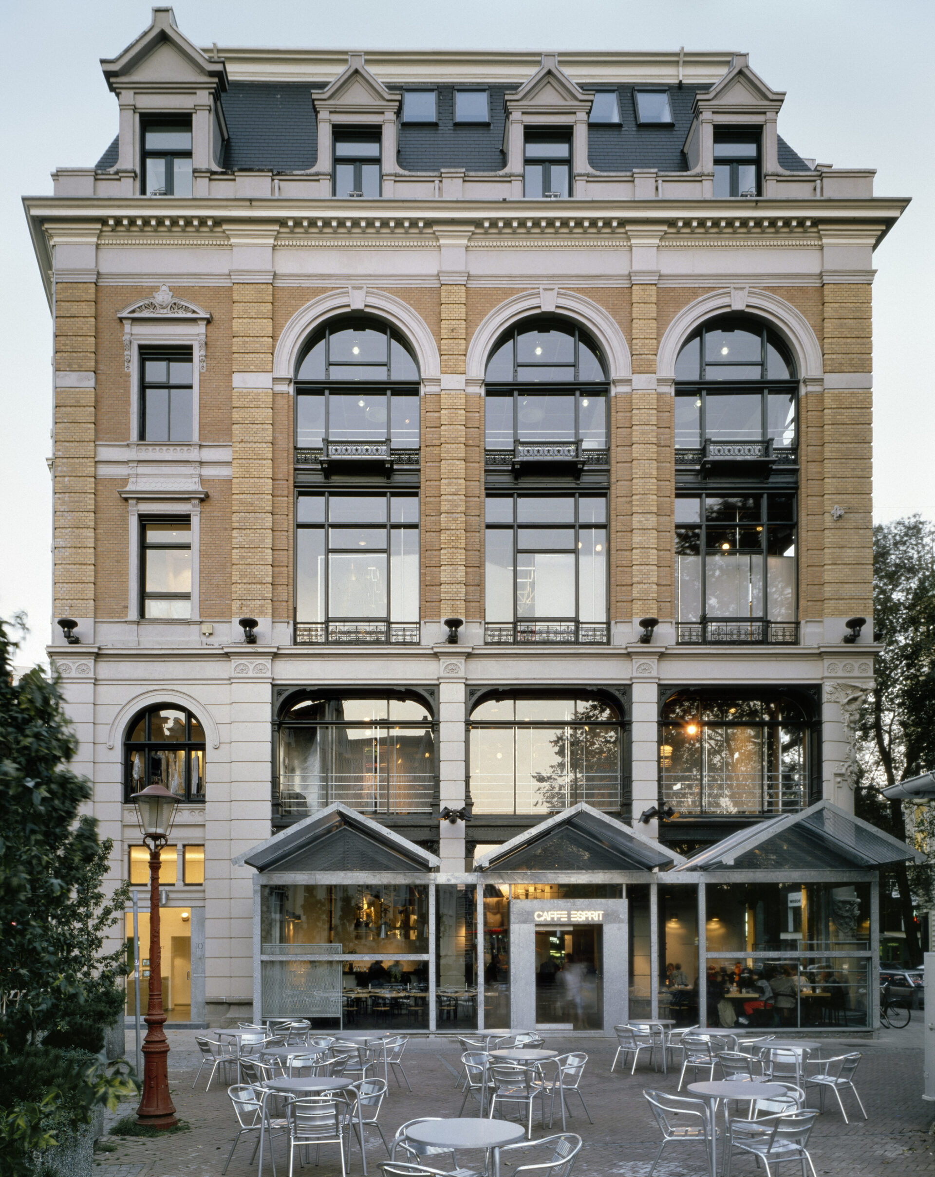 Adaptive reuse of a 19th-century palazzo in Amsterdam’s historic core into Esprit’s Benelux headquarters. Offices, showrooms, store, and café unfold within a new steel-clad framework that reveals its structure through the restored façade.