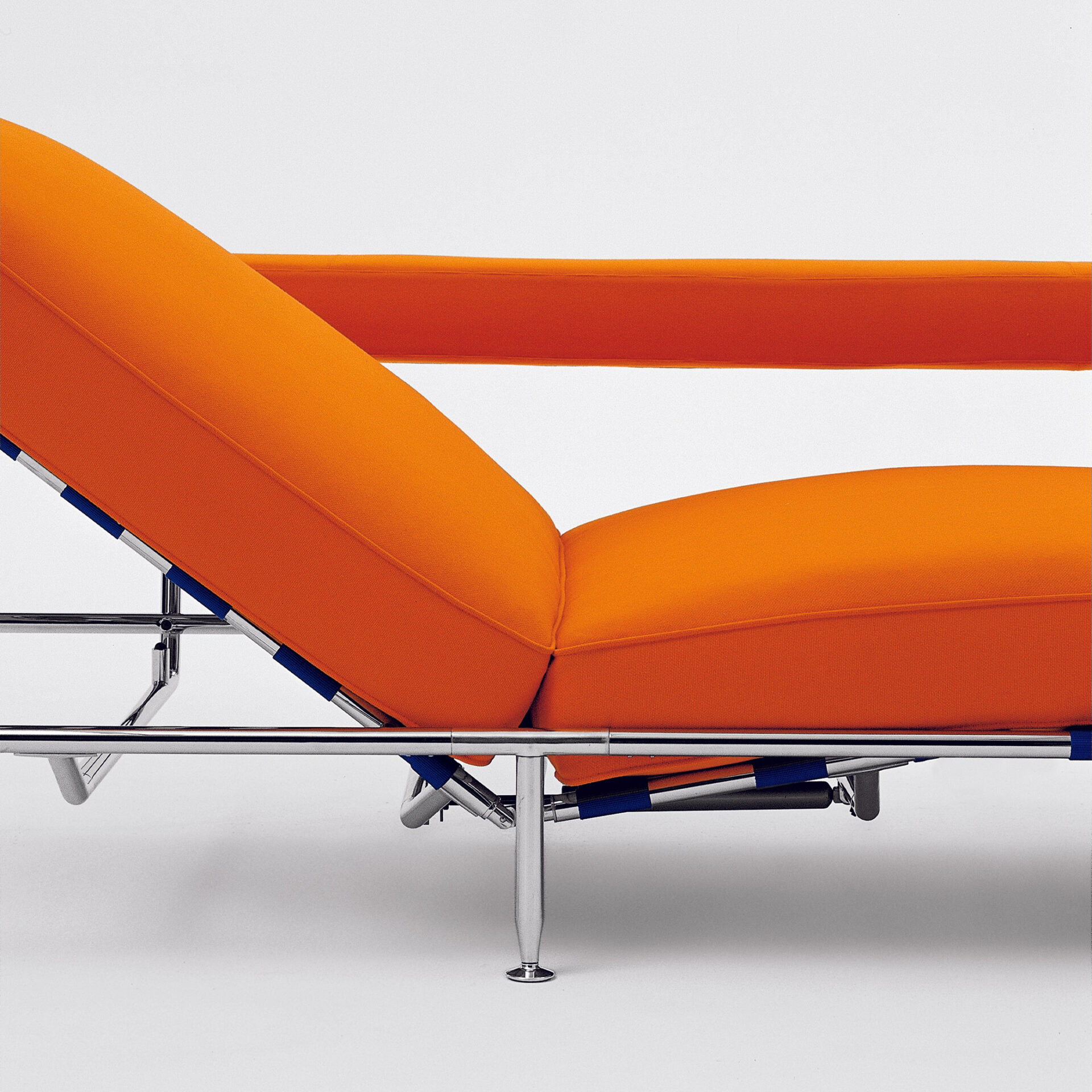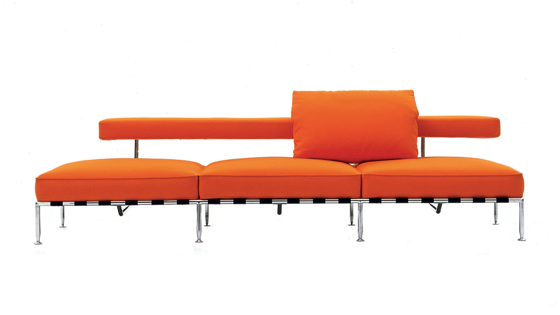 Modular seating system exploring informal comfort and open spatial layouts. Cushions rest on woven canvas webbing stretched across a tubular metal frame, extending the typological research begun with Sity toward a more adaptive, relaxed domestic landscape.