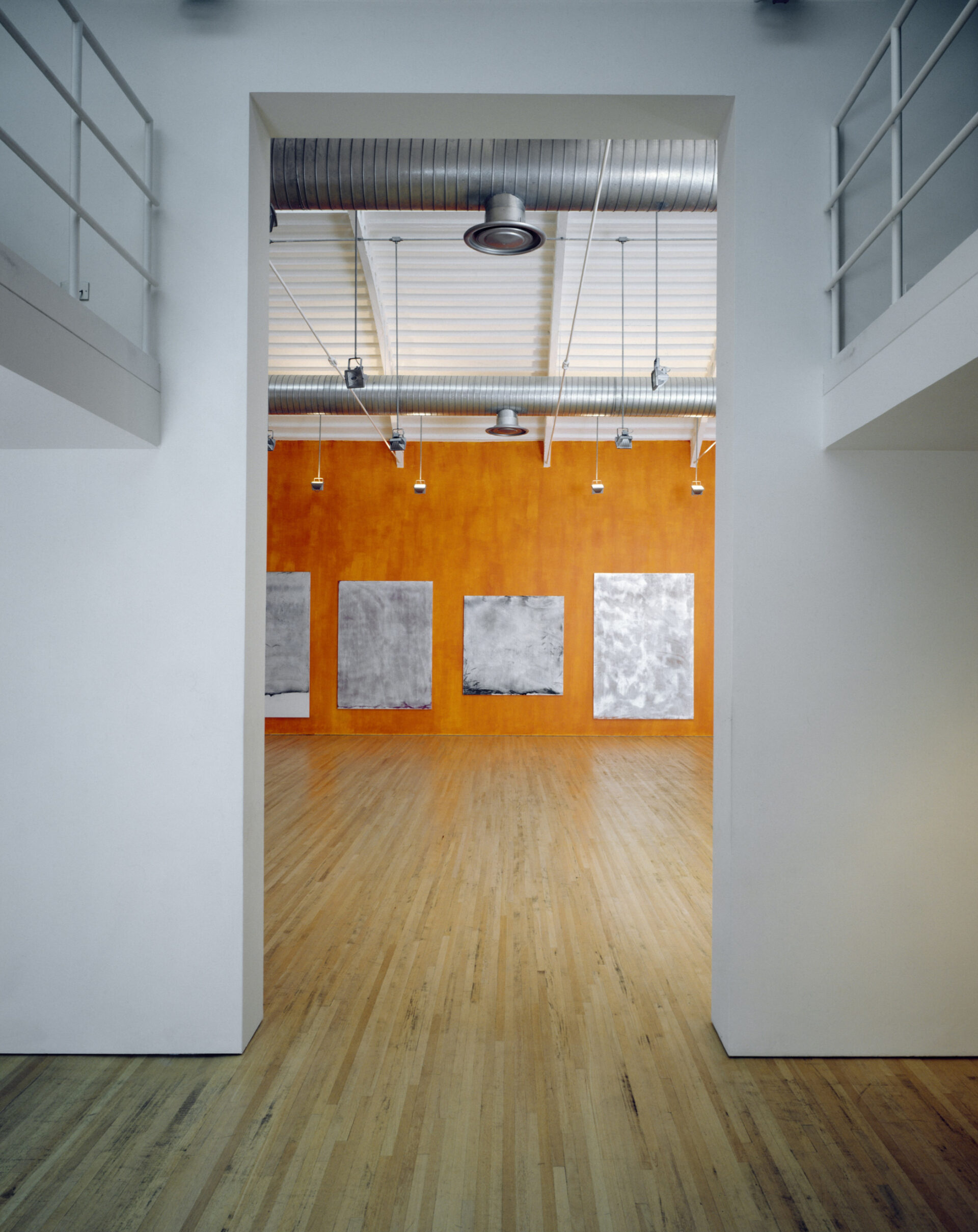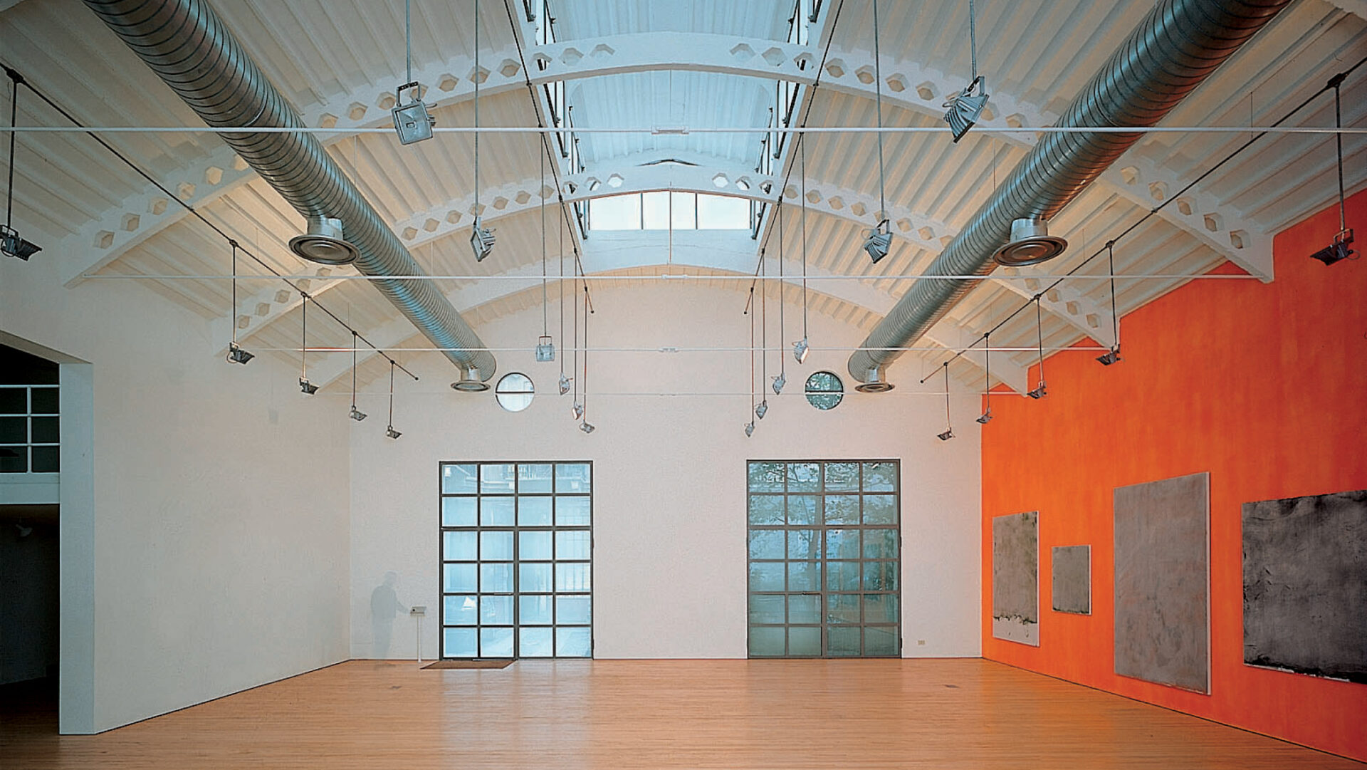 Adaptive reuse of an early-20th-century industrial space within a Milanese courtyard into a gallery: the concrete vault and skylight are preserved, with exposed services, steel-framed glazing, pale wood flooring, and white walls defining a neutral setting for art.