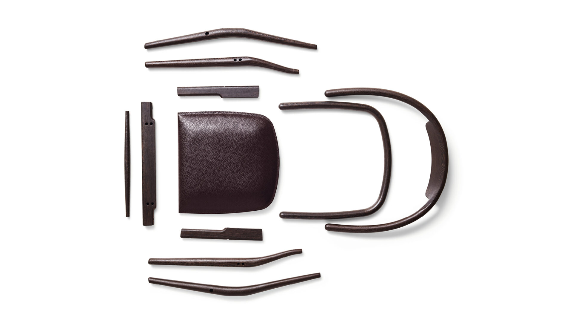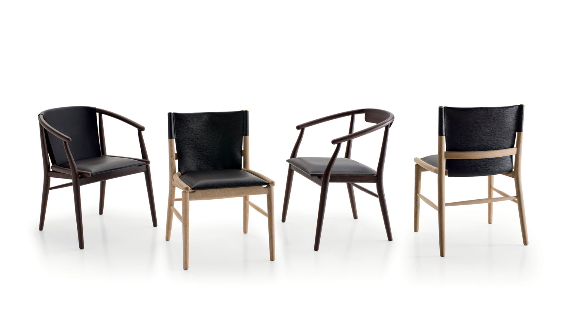 Collection of chairs and stools reinterpreting mid-century and Ming influences through five-axis wooden structures. Thick leather and woven seats emphasize material continuity and craftsmanship, translating historical archetypes into a contemporary design language.