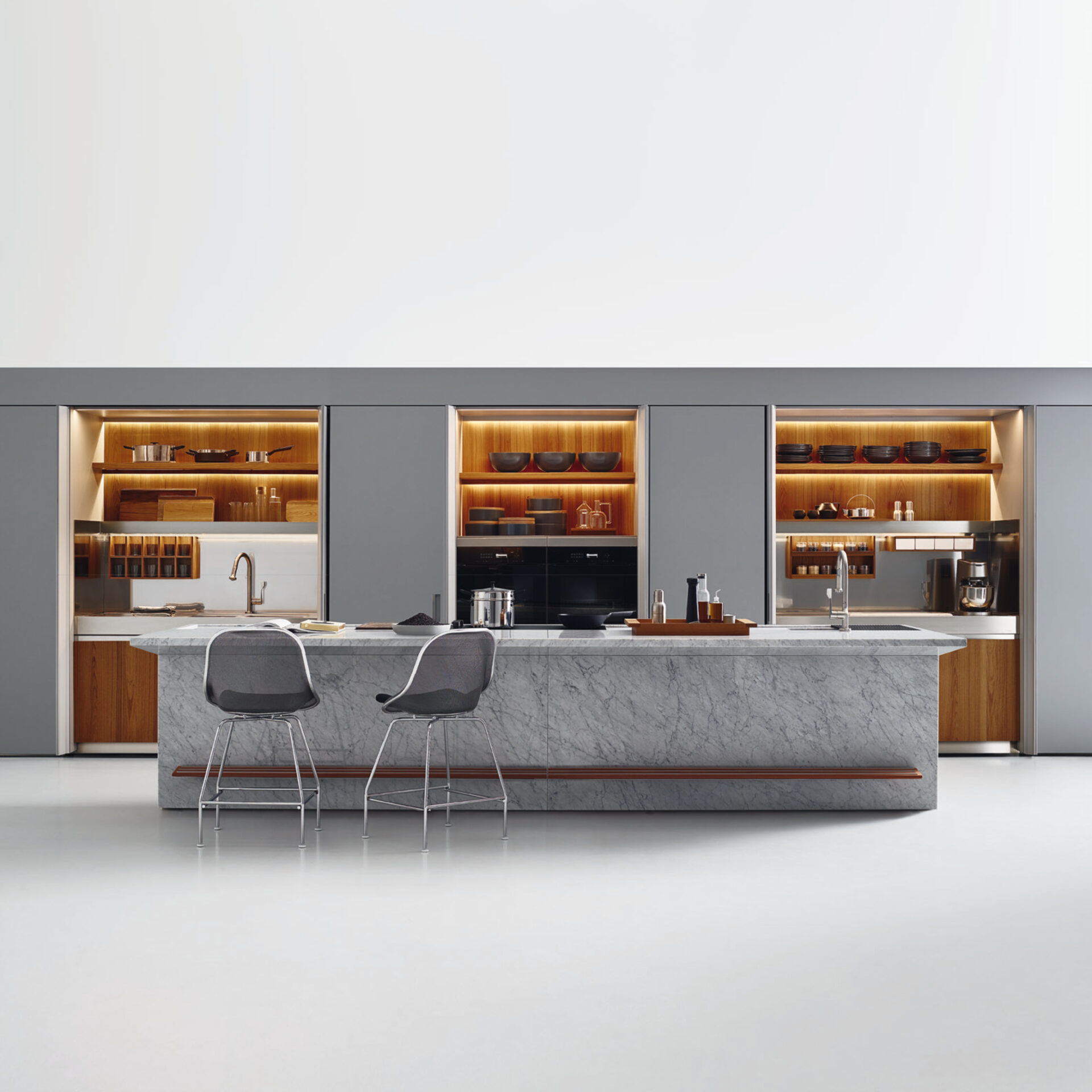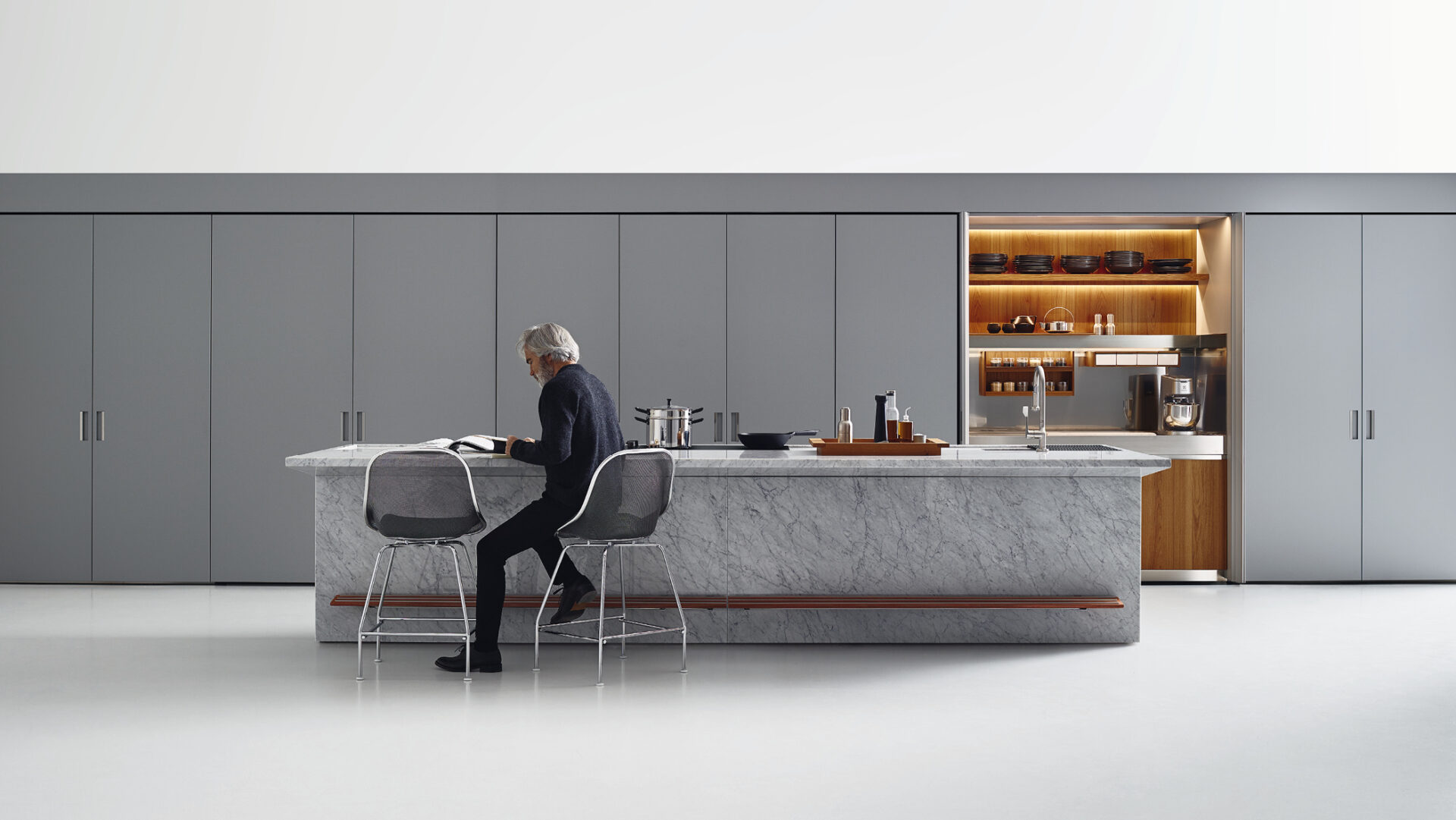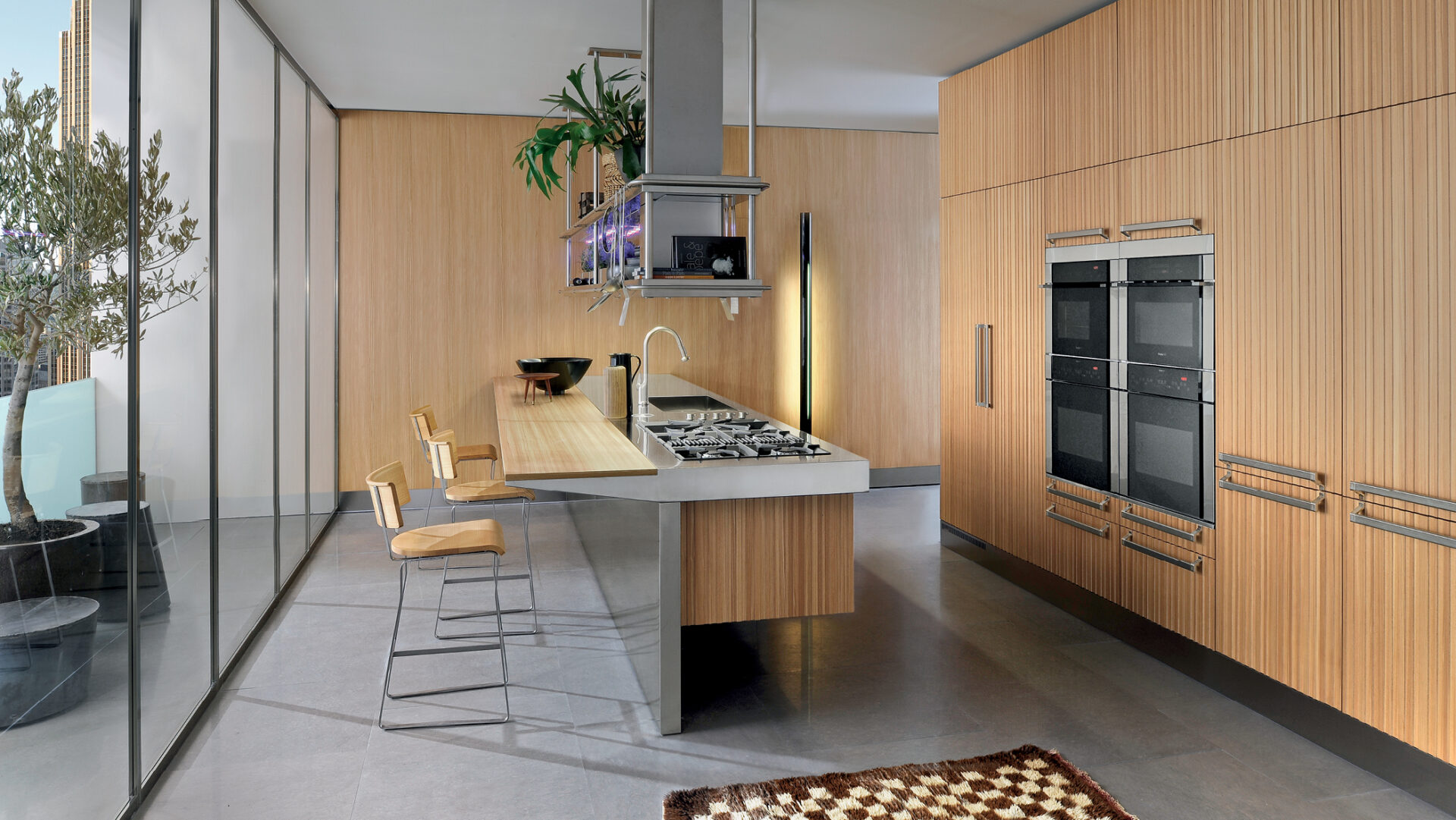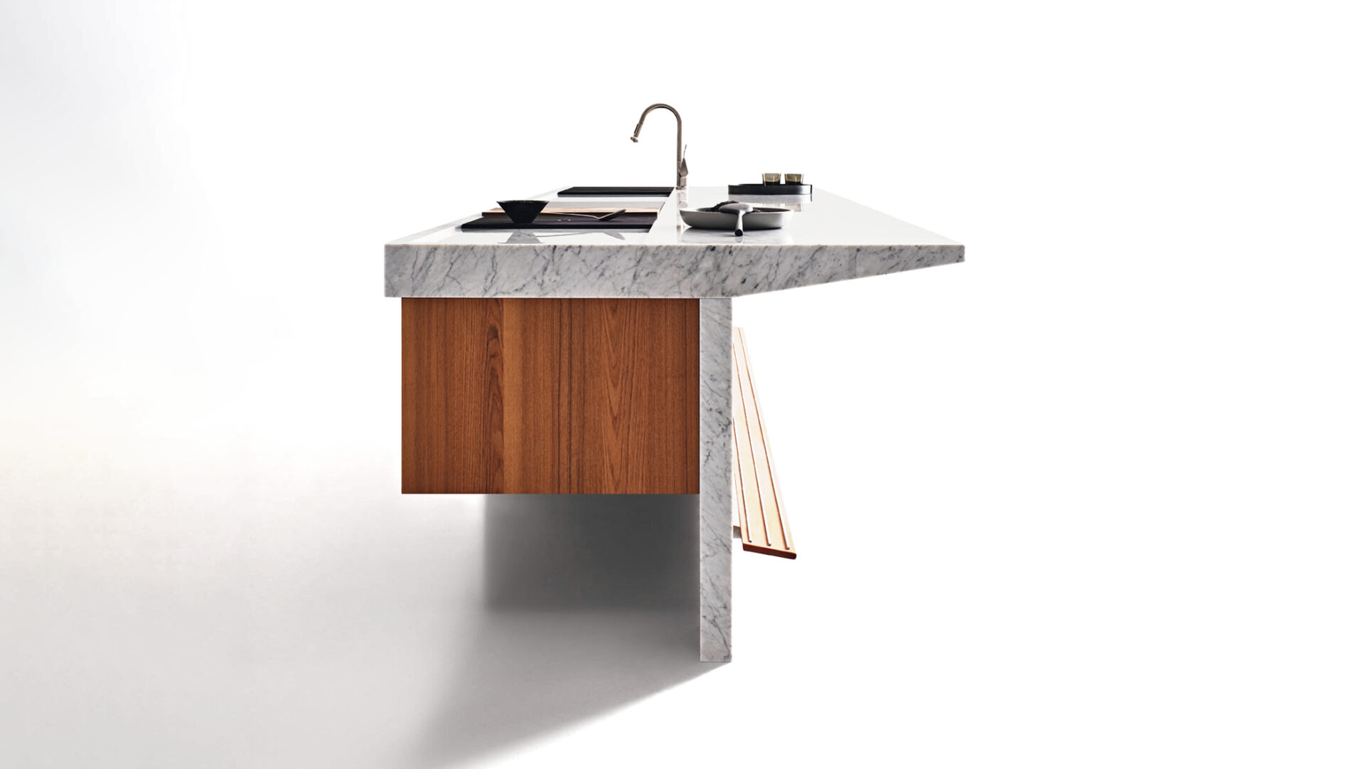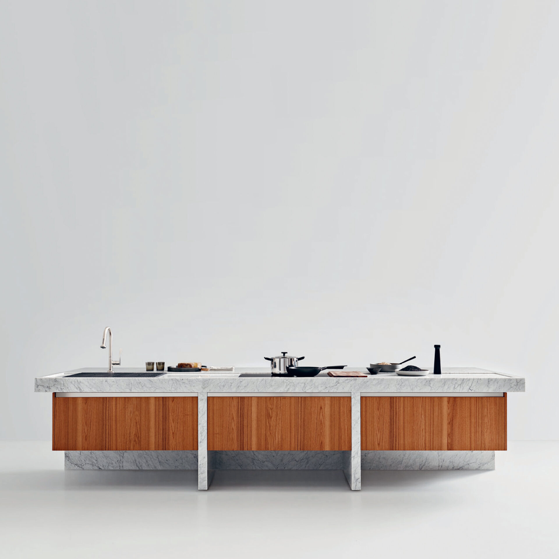 Lignum et Lapis explores the kitchen as an architectural space. Stone monoliths and slatted wooden fronts define a system where material, function, and precision coincide —an evolution of the idea of the kitchen as both workspace and social place.