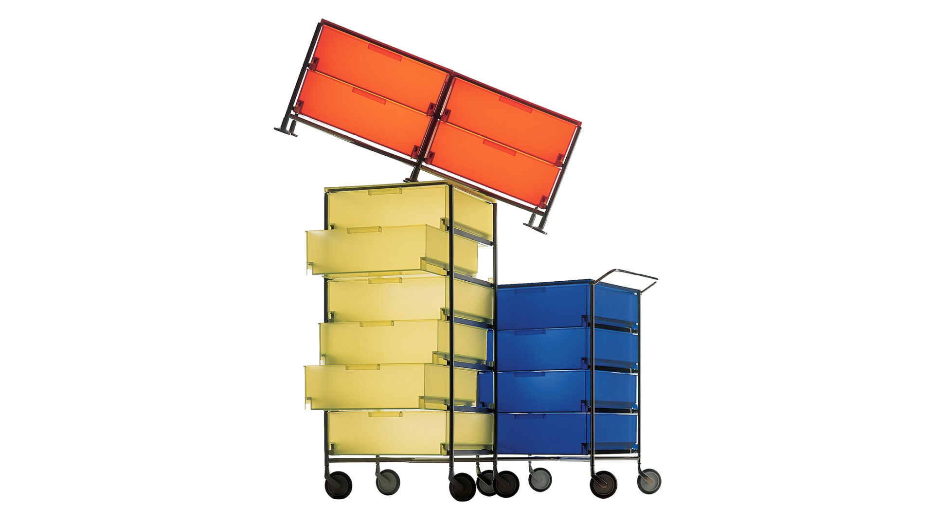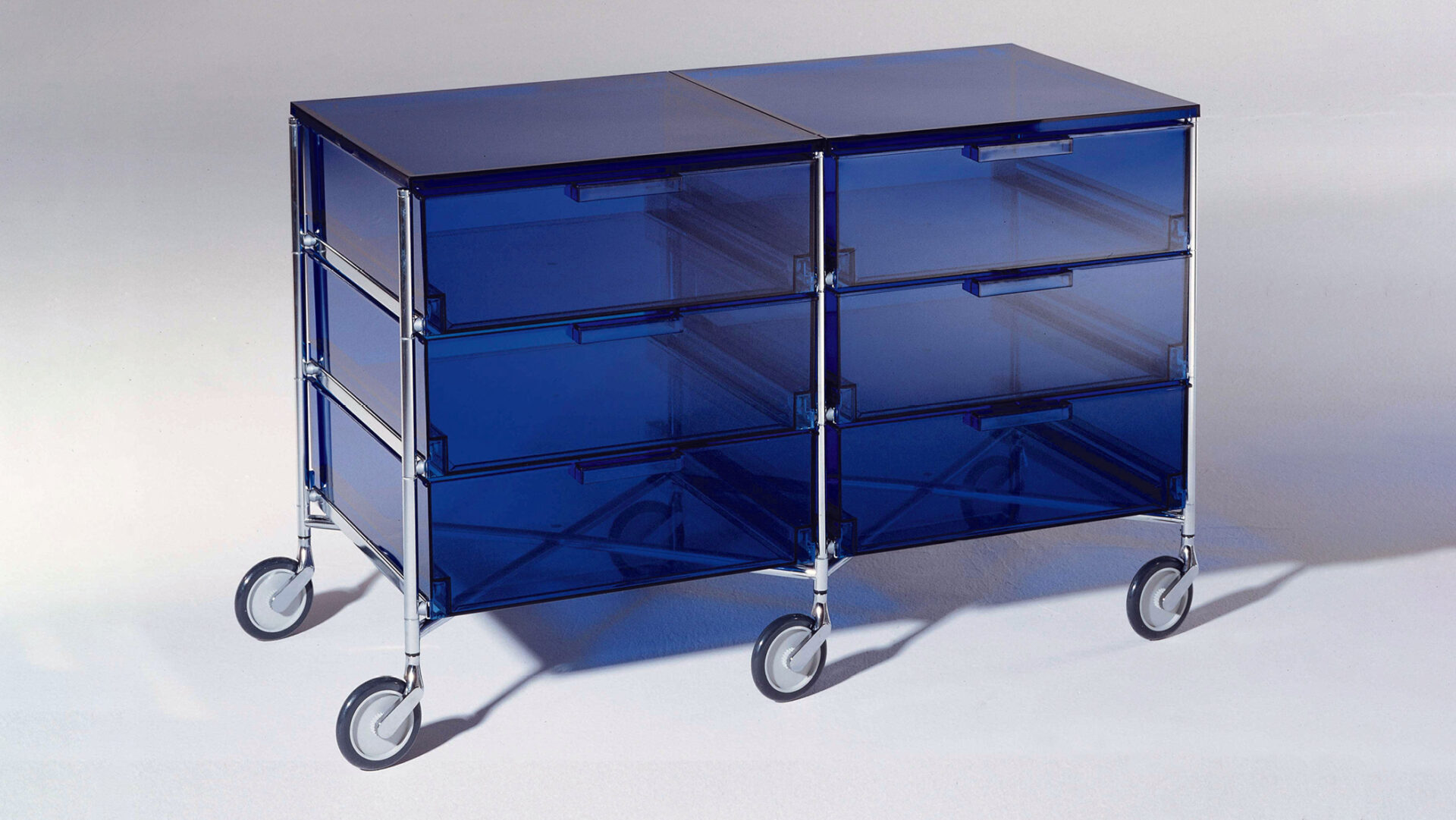 Storage system for Kartell that introduced the first use of frosted, semi-transparent PMMA, a material innovation inspired by etched glass. Established a new aesthetic for transparency later echoed beyond furniture design. Awarded the Compasso d’Oro (1994).