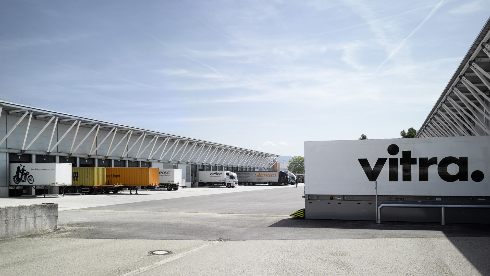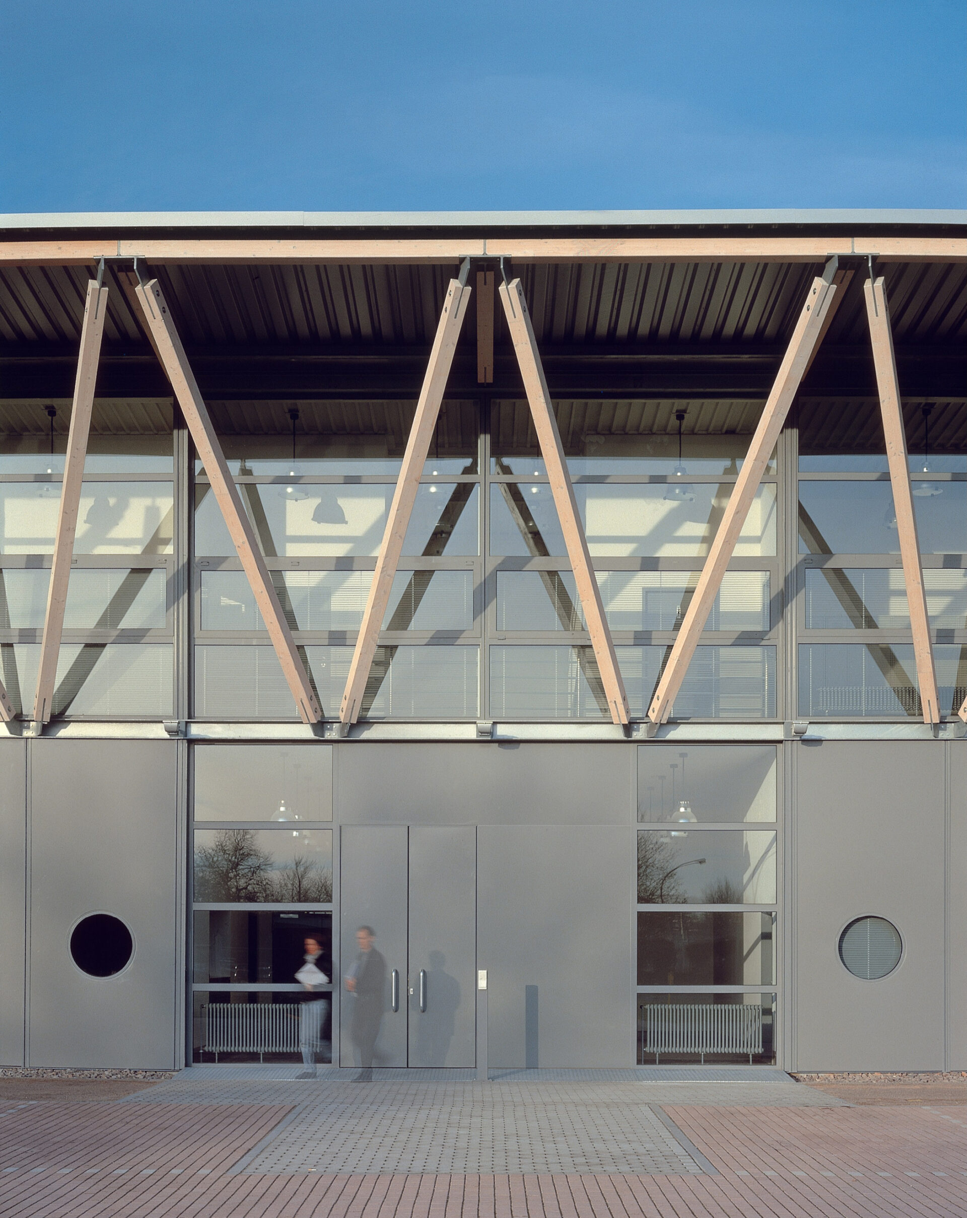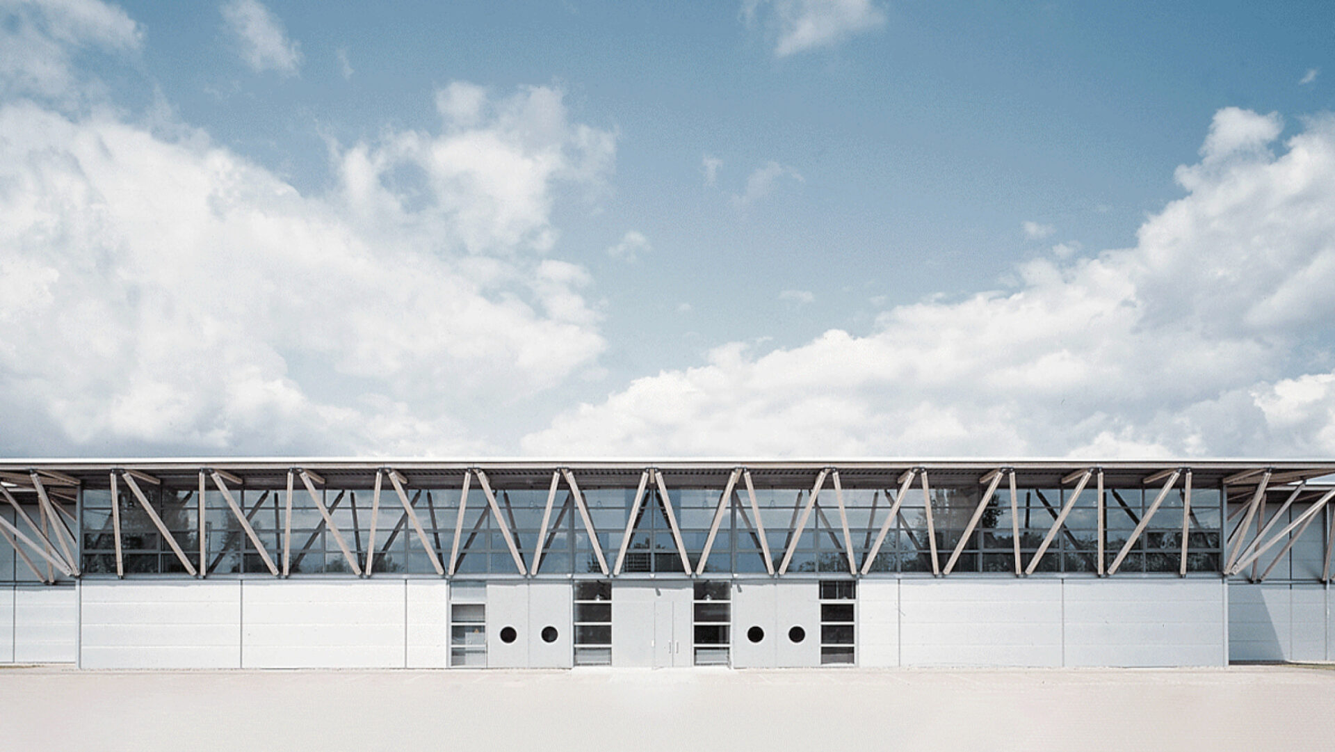 New-build factory for Vitra: an industrial hangar of 30-m spans with insulated aluminum panels and timber beams, a zinc canopy on V-shaped props, and abundant daylight via full-height windows and skylights.