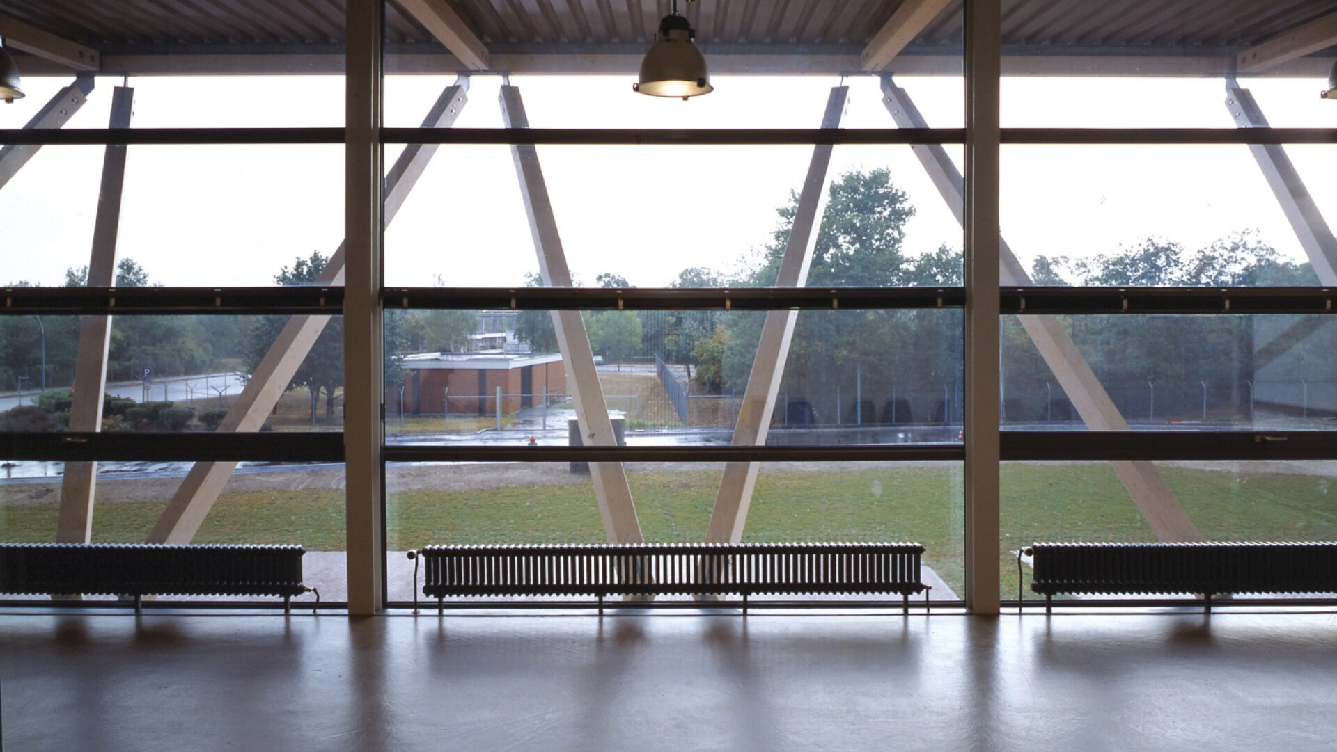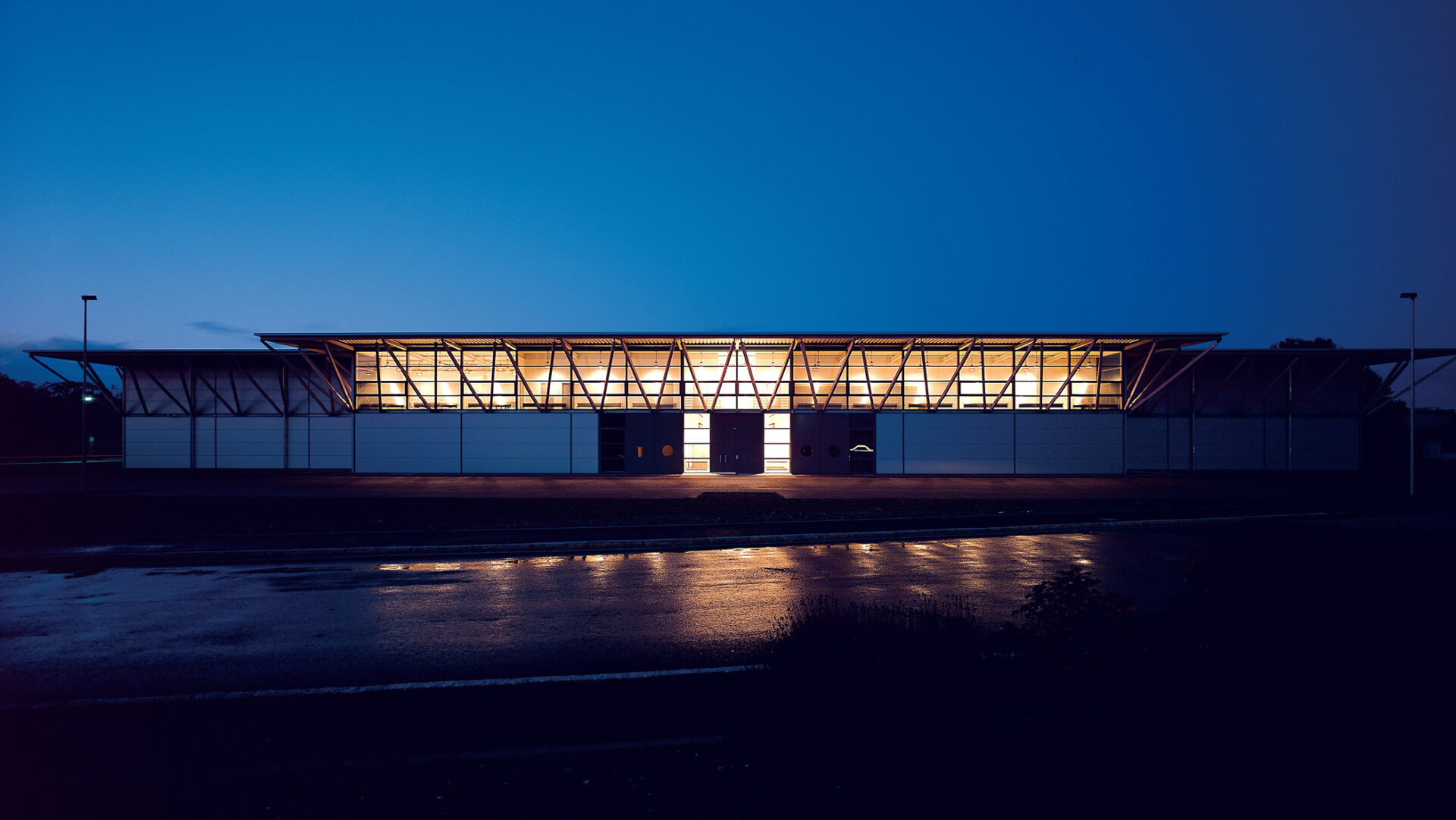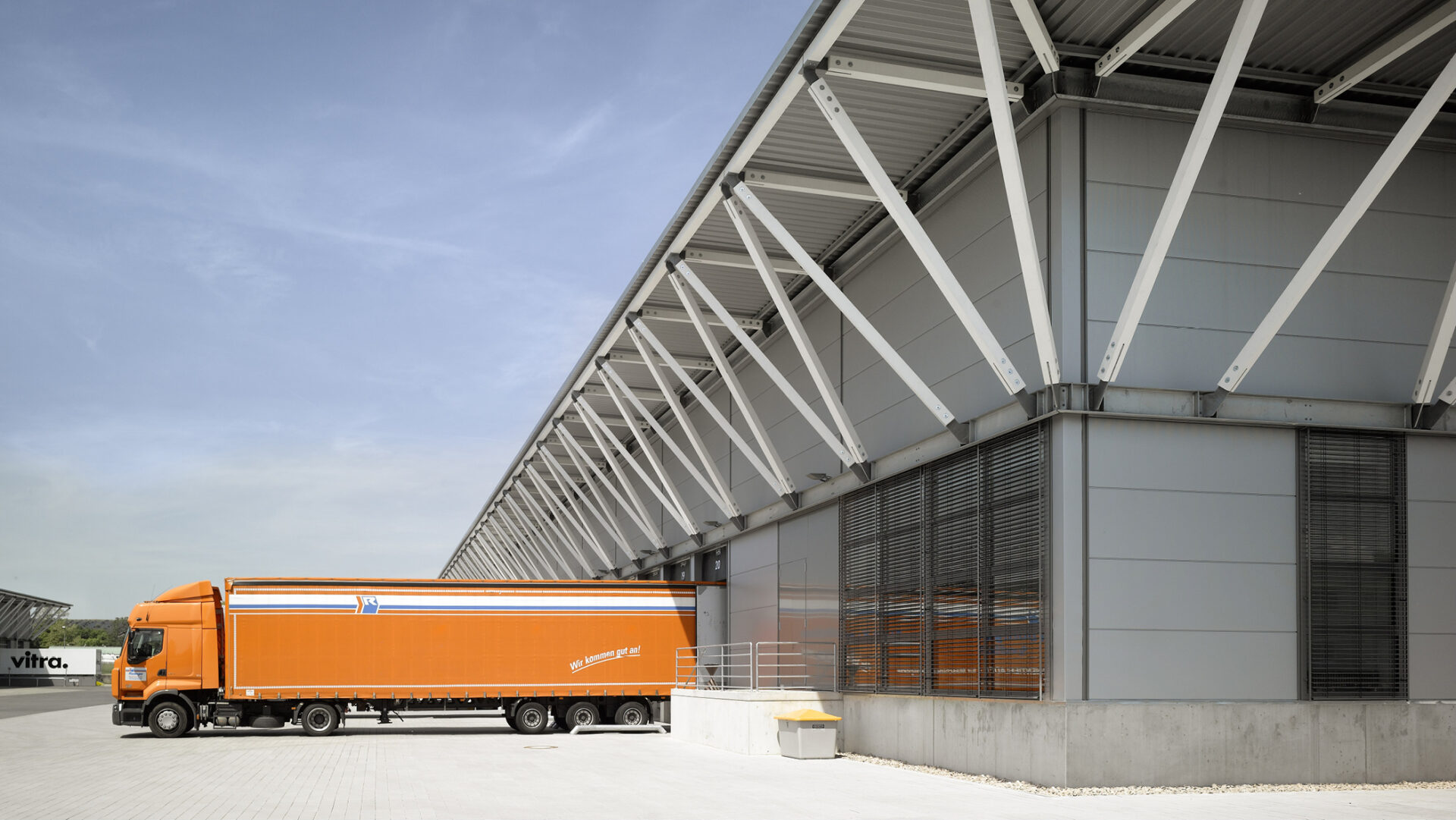 New-build factory for Vitra: an industrial hangar of 30-m spans with insulated aluminum panels and timber beams, a zinc canopy on V-shaped props, and abundant daylight via full-height windows and skylights.